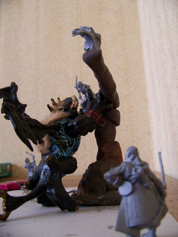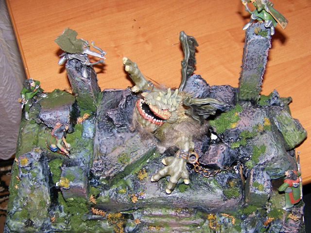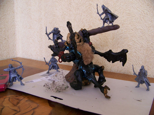 Всем доброго времени суток! Возникла идея создания виньетки с фэнтезийной тематикой. Дети добровольно пожертвовали старой игрушкой - монстриком, которого они прозвали Зозулей. Из-под кровати был извлечен набор от "Технолога" "Эльфы". Появился замысел свести в схватке этих запылившихся товарищей в лесной чаще. Зозуля (он же незванный гость) по замыслу пытается достать с дерева одного из "остроухих" - лесные братья готовяться дать отпор. Для обрисовки идеи пока использовано пластилиновое безобразие. Когда сойдёт снег, сходим в ближайший лесок за коряжкой, всякими веточками, корешками и т.д. и соорудим поле боя. А пока займемся конверсией фигурок и покраской.