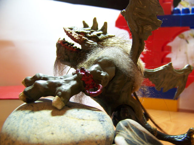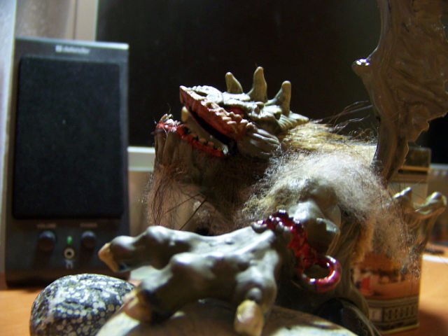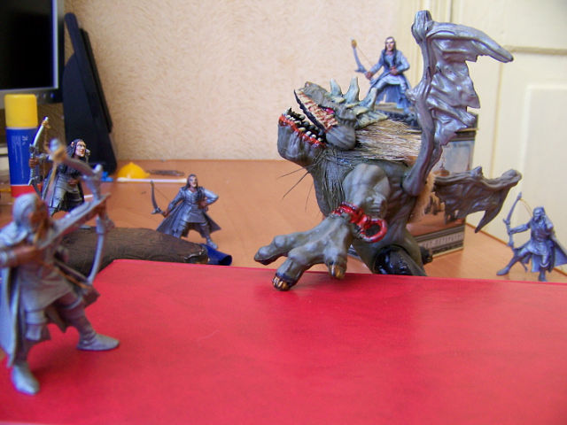 Нижние конечности и хвост Зозули, на мой взгляд, портят всё дело. На совете принято решение - пущай монстрилло вылазить из-под земли! Тогда ноги и хвост ему вроде как ни к чему. За сегодняшний день Зозуля перекрасился, изрядно покрылся шерстью. Продолжается работа над лицами эльфов, колчаны наполнены стрелами.