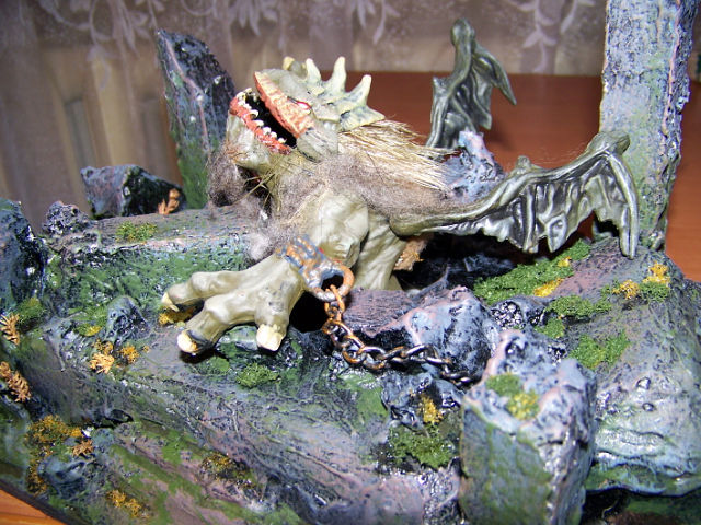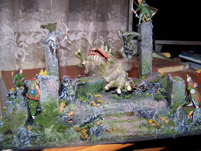 Идея виньетки за время работы несколько изменилась. Я отказался от "лесной" тематики и решил что действо будет разворачиваться у древнего могильника. Работа ещё не закончена, но очень хотелось поделиться тем что получается. Развалины могильника изготовлены из пенопласта и шпатлёвки. Всё покрашено акрилом, мох из обычной губки. Травка натуральная.