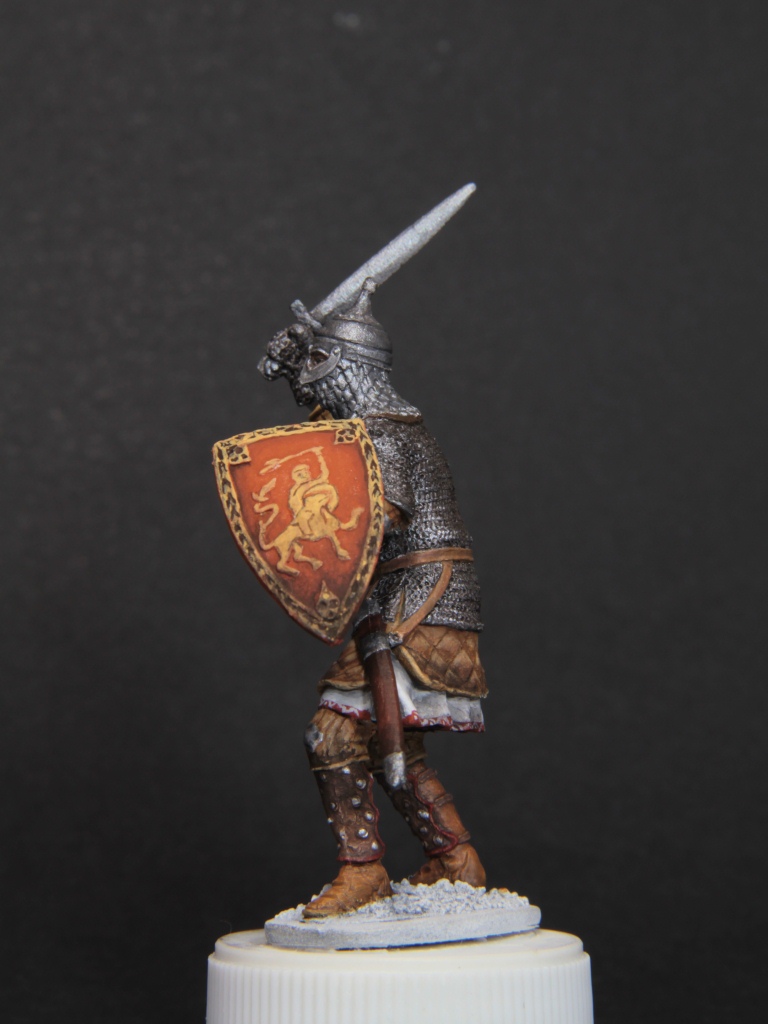 Oskar, Я тоже не крупный специалист в теме, но реконструкция щита, которая у меня есть предполагает, что рисунок плоский без выпуклостей. В моем случае деталировка как я уже говорил оставляет желать лучшего и думаю, что выпуклость исчезнеть в слоях краски или ее особо не будет видно. Что касается кафтана или рубахи не знаю что на нем одето из одежды, думаю красить буду не в синий цвет, а в какой-то теплый тон, чтобы не повторяться с тобой и по цветовой гамме было более гармонично.