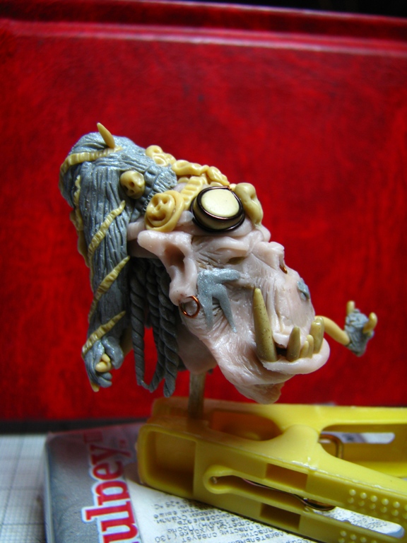 долепил гриву. добавил косички. немного черепов на прическе. лейкопластырь на морде. слева на скуле начал лепить шрамы- добавлю пару швов. стал напоминать главного злодея в гибсоновском апокалипсисе.