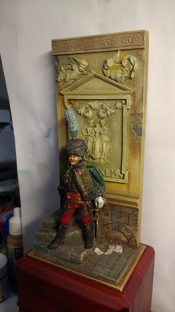 Добавил на базу листья, мох, мусор, обрывки газеты (Журнал де ль'Эмпайр от марта 1814), зафиксировал фигуру, запылил ей штаны и сапоги, поработал маслом над лицом, стало кажется лучше. Думаю вечером пройдусь маслом по перчатке, одно из тех мест где недоволен результатом. Когда все просохнет, задую лаком матовым.