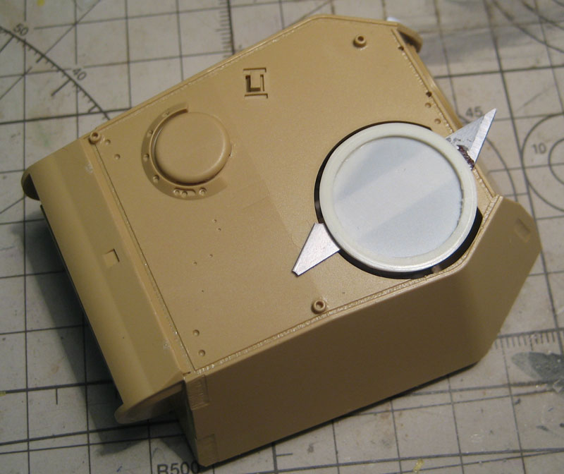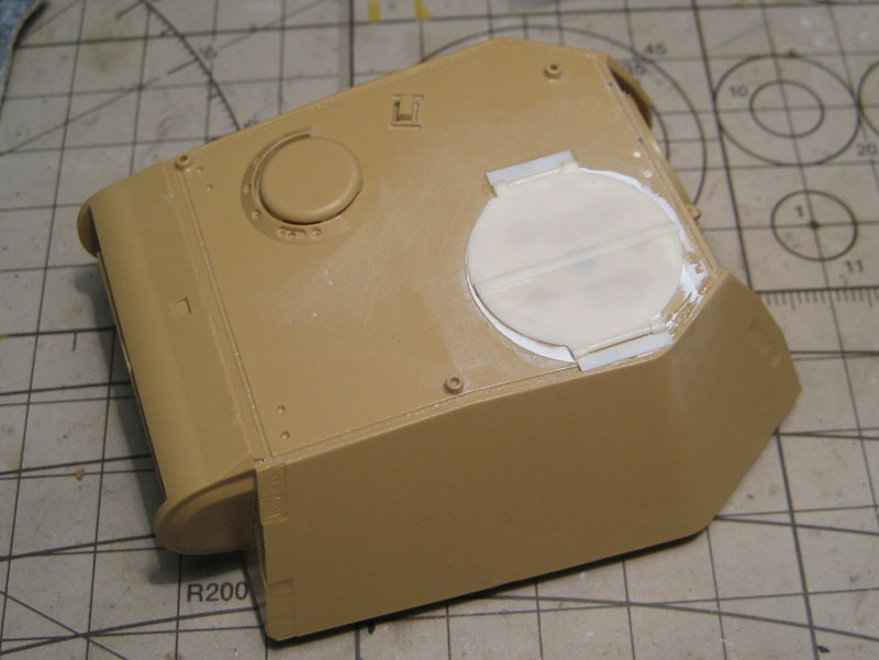 Также поработал и над башней. Снова столкнулся с недоработкой сотрудников СМК. Начал устанавливать створки люка, но обнаружилось, что они не совсем верно сделаны, если сравнить с фоткой крыши настоящего Эрзаца. В результате у люков были сточены ранты на внутренних сторонах, чтобы они просто лежали на башне не возвышаясь над ней. Также доработал шарниры люков. Они были не совсем верны.