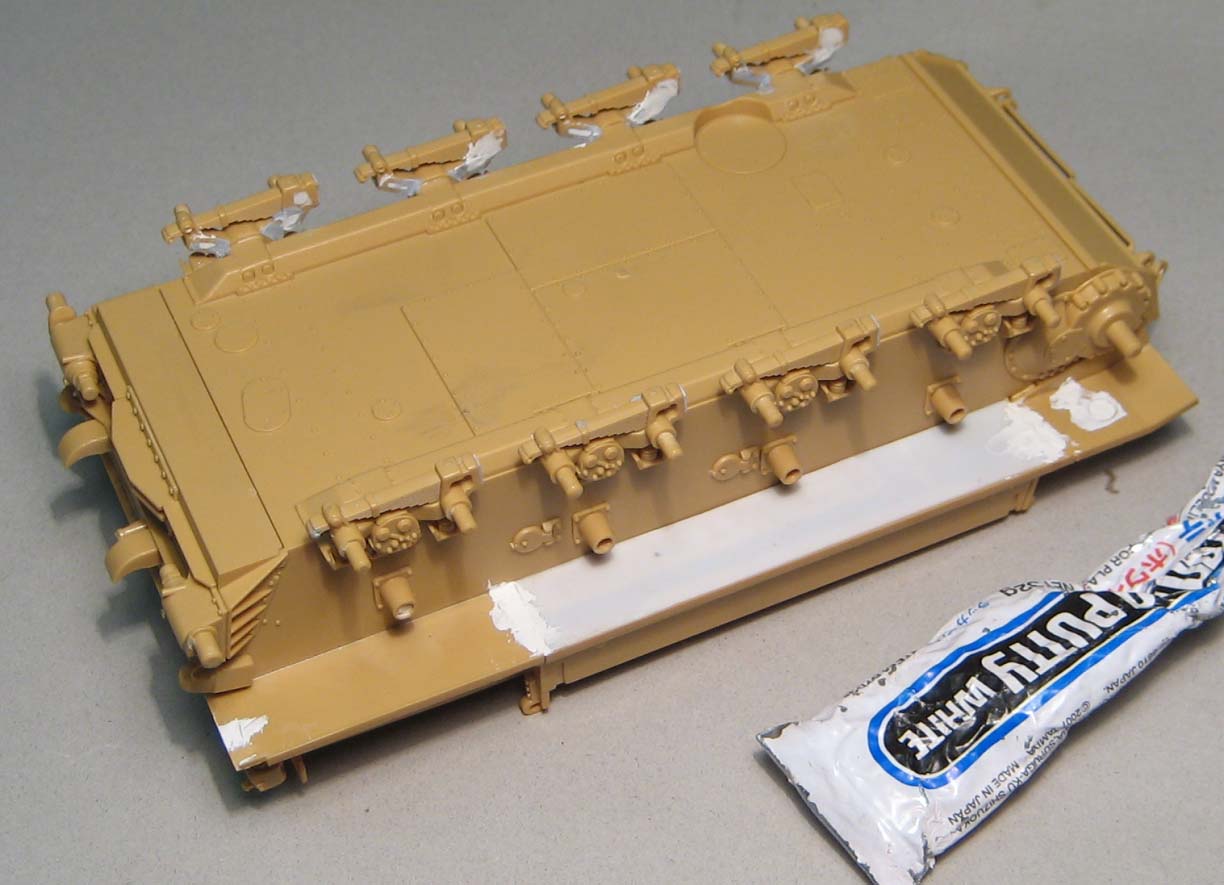 Работы по корпусу немного затянулись. Более детальное изучение матчасти выявило некотрые недостатки. Демпферы Тамия дает ранние, а на прототипе стояли уже поздние... Надо это всё менять. На помощь опять пришли лишние детали от тристаровских моделей.