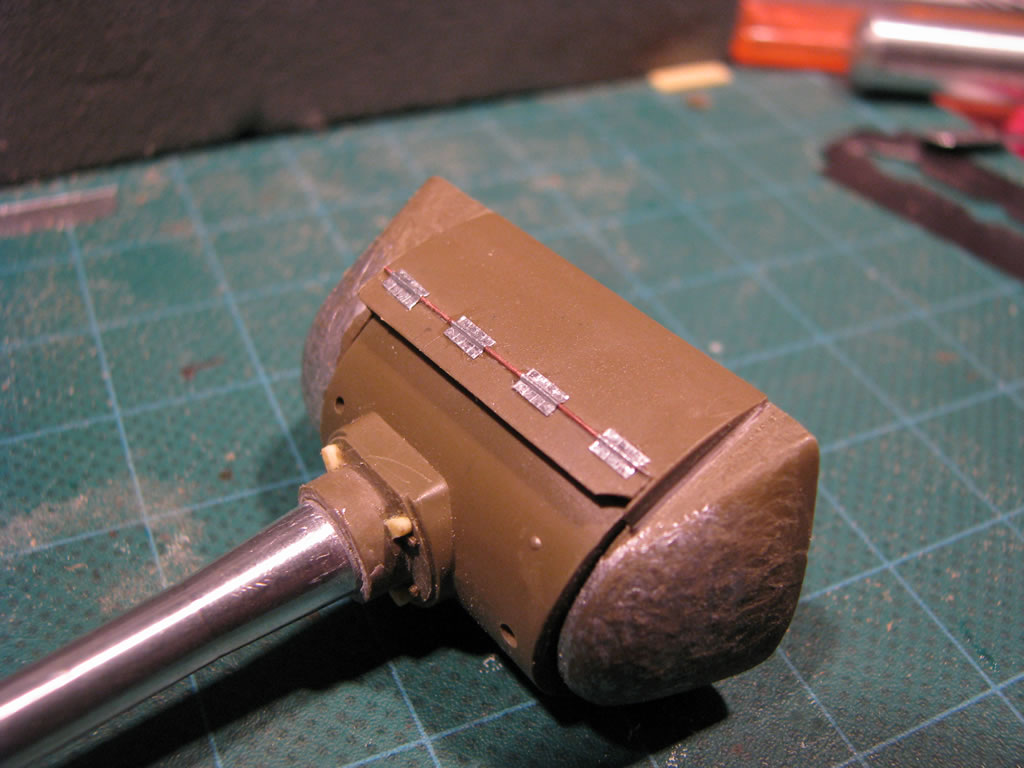 Найденные утяжины, были залиты эпоксидной шпаклёвкой, и впоследствии были зачищены буром, зажатым в патрон минидрели, в некоторых местах броне был придан более шероховатый вид. Сымитированы сварные швы буксирных рымов, кромки выхлопных патрубков доведены до масштабной толщины, ограждения сточены до соответствия масштабу. В одном из ящиков ЗИП имитированы пулевая пробоина и вмятина, одно из крыльев частично срезано, второе доведено до масштабной толщины, «продырявлено» осколком и погнуто. Фара из набора доработана – корпус рассверлен, добавлен отражатель, следующим этапом залит двухкомпонентный прозрачный эпоксидный клей и наконец сверху положен рассеиватель из прозрачного пластика выпуклой формы от пищевой упаковки, с нанесённым резаком рисунком. Раструб сигнала также доработан путём рассверливания, в завершение работы над фарно-сигнальным узлом проводка имитирована проволокой.