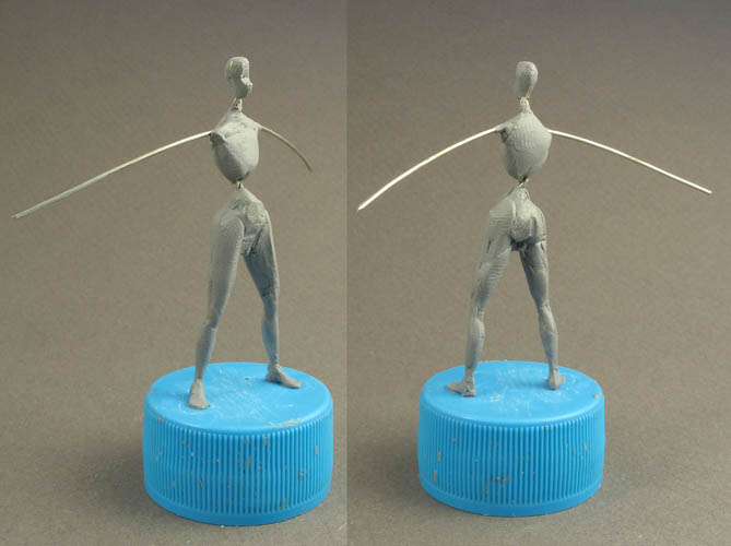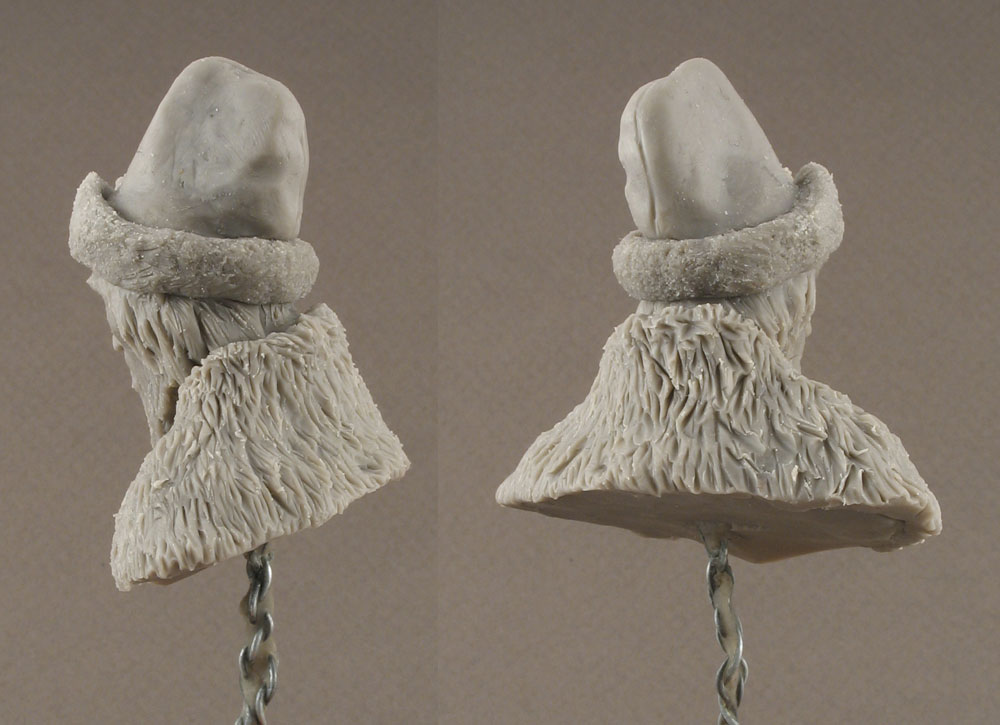 Вообще в последнее время стал склоняться к тому, что сначала надо вылепить практически полностью фигурку обнаженной, а затем уж делать одежду. Так и драпировку делать легче и с объёмами и постановкой позы ошибиться труднее, а уж о пользе в плане анатомии для фигурки и говорить не приходиться.