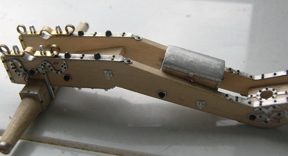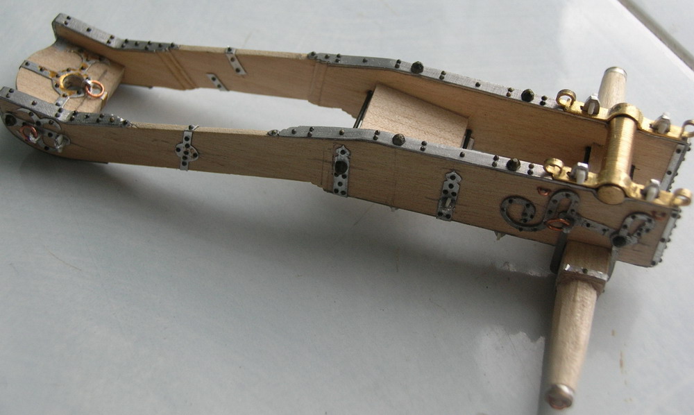 Продолжу.На фото.5а передняя часть лафета. Сбоку видно стремя для дополнительного крепления лопасти оси к станине. Сделано почти по настоящкму. Опять же прутик из припоя. Далее проковал его молточкм, придав ему нужную форму.Приклеил.Слева видна фигурная головка болта проходящего по вертикали сквозь оковки и лафетную доску. Для изготовления таких головок из гвоздя сделал пуансон, в пластине их припоя пробита матрица и далее как с заклёпками.Намётки для крепления цапфенных накладок выточены из люминия. Сами накладки из листоаой латуни толщиной 0,5 мм.Ушки для цепоче закладок намёто, кольцо для для оття жного каната и привязывания принадлежности из медной проволоки.Крестовина на хоьотовой подушке верезана из алюминиевой фольгиВсе остальные накладк и стяжки тоже сделаны из припоя.Концевые оковки осей их трубочекнеобходимого диаметра (Модел Пойнт).
