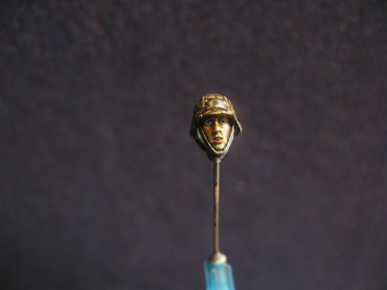 В качестве грунта XF-1(эмаль),далее акрилом из аэрограф перпендикулярно складкам,оставляя затемнения,основной цвет.Затем Валеджио кистью.в конце масло.