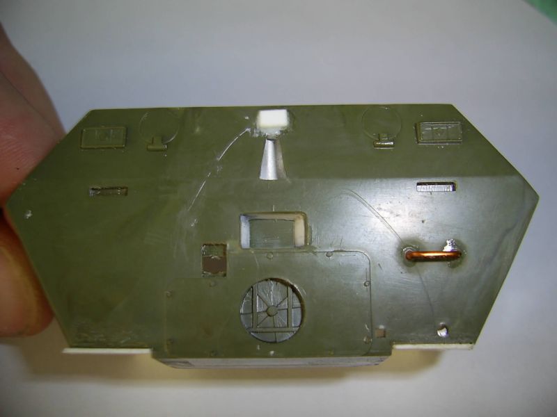 Корпус, похоже, таки короче в передней части. Должен быть сварной шов перед пулеотбойником. Его нет. И петли люков, по большому счету, будут упираться в башню. Верхние крышки люков все-таки пришлось сточить. Получается уже не копийно, но деваться некуда. Сами крышки люков стали меньше. Пришлось заделать отверстия под верхние и передние крышки люков. Передние крышки будут чуть опушены вниз, а то петли тоже не поместятся. Перископы на ботрах срезал. Они должны быть немного ниже. Сами обзерочки не выбрасваем: их потом наклеем и на них потом будем лепить жесть. Верхние перископы на крыше десантного отделения тоже будем выбирать изнутри.