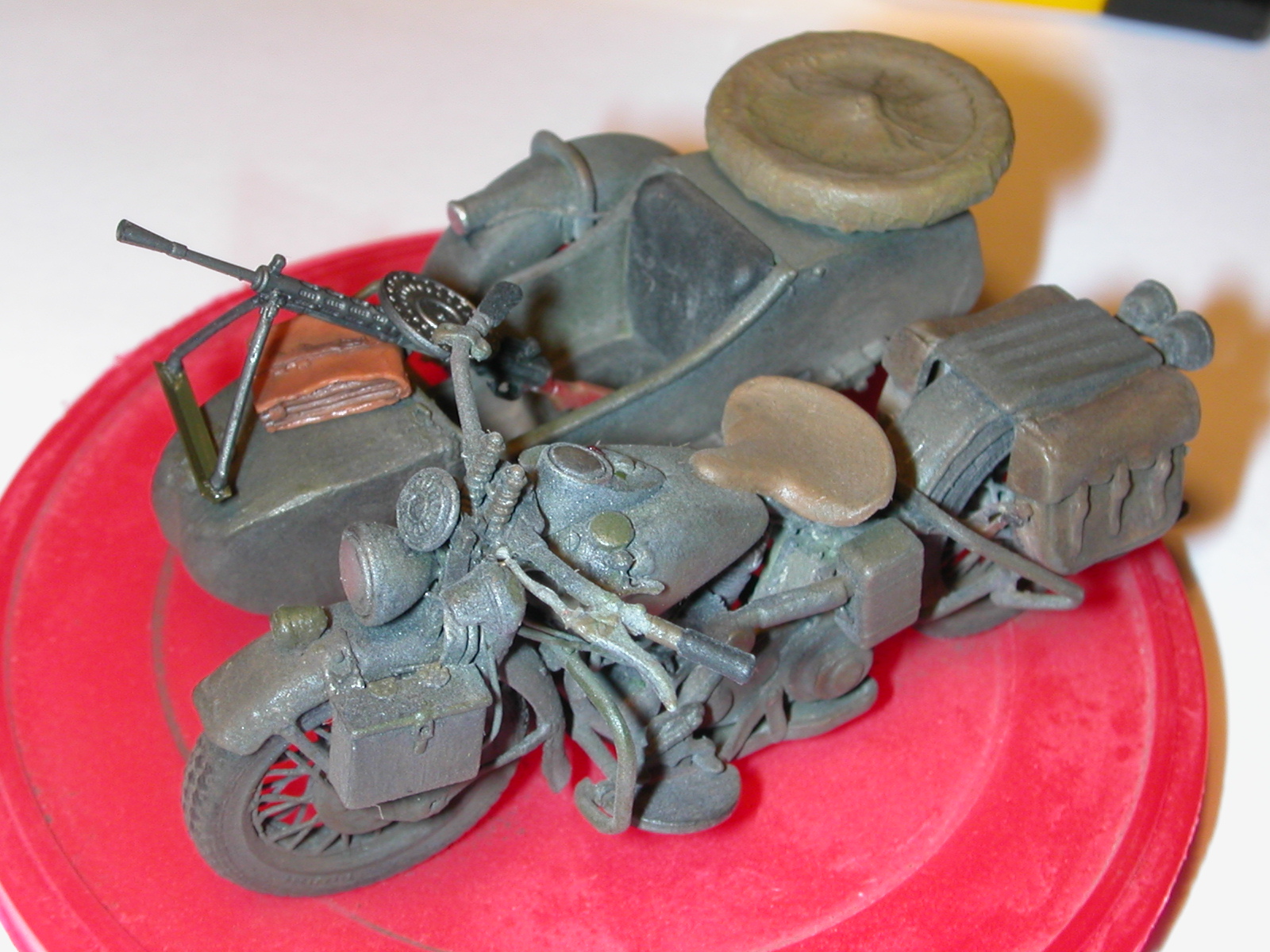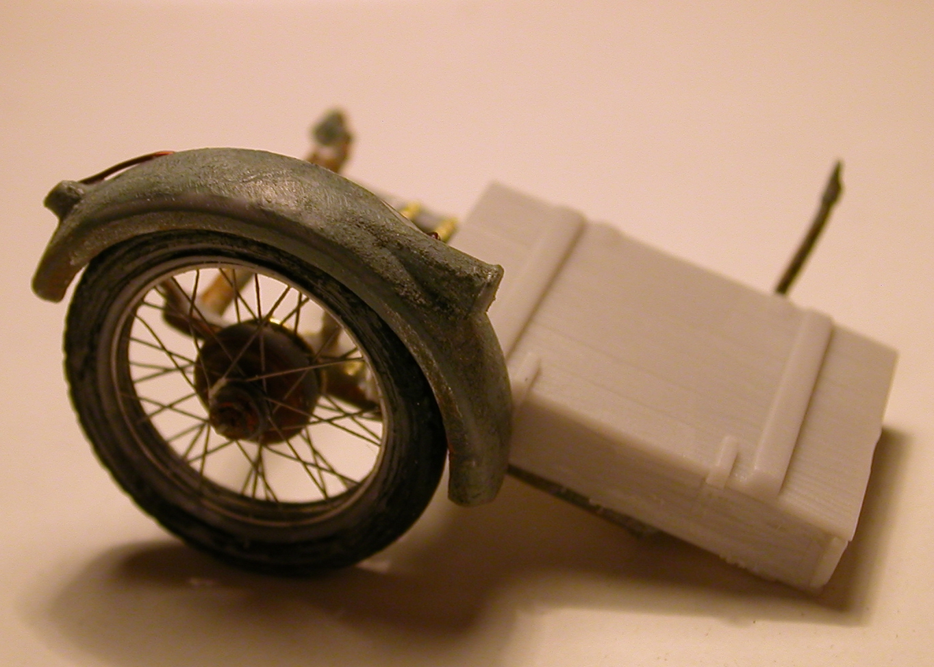 Наконец вышел на финишную прямую по...(не так давно размещал фото харли с коляской из сопровождения). Делаю расчет минометчиков на 2-х харлеях с колясками (на одной из которых будет располагаться 82-мм батальонный миномет обр. 1937 г.от "Сталинграда"). По штату и фотографиям как смог разобраться, один миномет обслуживали 4 чел. с сопровождением из 2-х мотоциклов на одном из которых как раз и располагался сабж. По коляске с минометом сделал заготовку, шасси от коляски Р-12(Звезда) с установленным на нем креплением для миномета и уложенным поверх рамы ящиком для 76мм снарядов от наших родных пушкарей - эт моя личная фантазия по украшению экстерьера, в ящике может быть размещен, как ЗИП, так и 4 мины(взят из набора бронебойщиков от миниарта, т.к. расчет миномета будет конверсирован из них). Уважаемые комрады, вопрос в целом прост! В интернете нашел всего 3 толковых фотографии по данному вопросу, о коляске с минометом… Хочется услышать предложения, советы по данному вопросу! Возможные способы крепления миномета, расположение зарядных ящиков и их крепления (предполагаю что часть из них перевозилась на 2-ом мотоцикле расчета). Тему взял неизбитую, ну уж очень хочется – привлекали меня всегда харли в советском колоре.