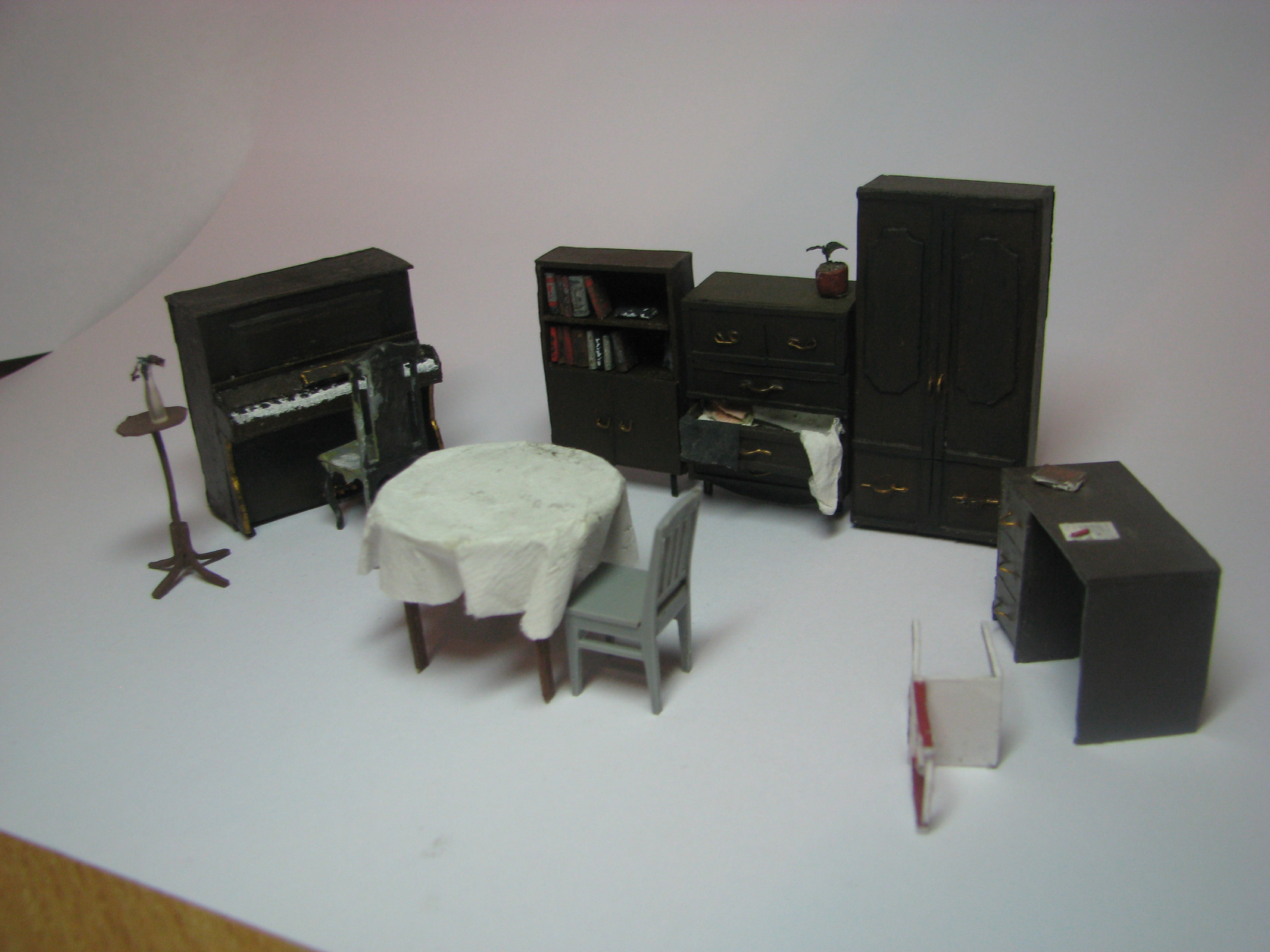 Тёзка, очень даже неплохо. Поработать немного над чистотой работы с материалои и покраской.Однако, если ставить мебель где нибудь в диораме, в разрушенном здании, с пылью и прочим, очень даже хорошо. А уж как украшают такие вещи диорамы. Мебель, посуда. картины и фотографии на стенах. Есть где развернуться и совершенствоваться. Ну и внимателное оношение к времени (когда и что было). У Вас здорово получается. Успехов Вам в работе и поисках.