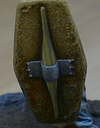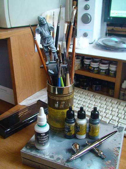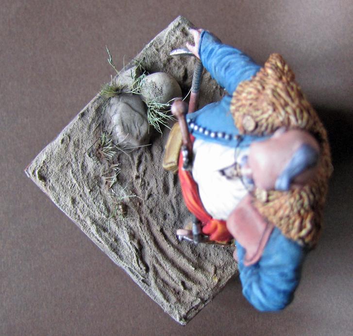 Кафтан и шаровары казака расписаны с учетом этого факта. На базовый цвет нанесены пробелы. Потом вся поверхность была очень щедро залита сильно разведенным цветом тени, сильно отличным от базового с добавлением разбавителя для аэрографа и матовым медиумом. Потом "по мокрому" тон углублялся постепенно в соответствии с логикой света и тени. Работать надо было очень быстро, не давая засохнуть, как в акварели. В итоге фигурка как бы погружается во мрак. Да, в конце кавтан был высветлен, запылен, выпачкан, сымитировано выгорание ткани с помощью Миговских пигментов.