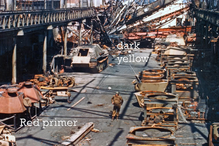 Вы о той фото, где на переднем плане стоят уже полностью собранные башни Пантер в красной грунтовке, на заднем плане полусобранная JP без орудия и маски и на полу лежат кверх ногами несобранные башни. Это не базовый жёлтый это светло серый цвет, так называемая серая грунтовка, а точнее антикоррозийное покрытие фосфат цинка если не ошибаюсь. Оно наноcилось непосредсвенно на метал по всей видимости производителем корпусов и башен и в таком виде поступало на завод. А уже на него наносилась красная грунтовка и затем окраска.
