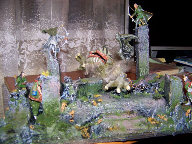 Всем доброго времени суток! Возникла идея создания виньетки с фэнтезийной тематикой. Дети добровольно пожертвовали старой игрушкой - монстриком, которого они прозвали Зозулей. Из-под кровати был извлечен набор от "Технолога" "Эльфы". Появился замысел свести в схватке этих запылившихся товарищей в лесной чаще. Зозуля (он же незванный гость) по замыслу пытается достать с дерева одного из "остроухих" - лесные братья готовяться дать отпор. Для обрисовки идеи пока использовано пластилиновое безобразие. Когда сойдёт снег, сходим в ближайший лесок за коряжкой, всякими веточками, корешками и т.д. и соорудим поле боя. А пока займемся конверсией фигурок и покраской.