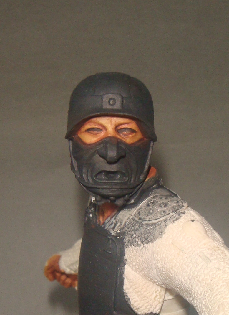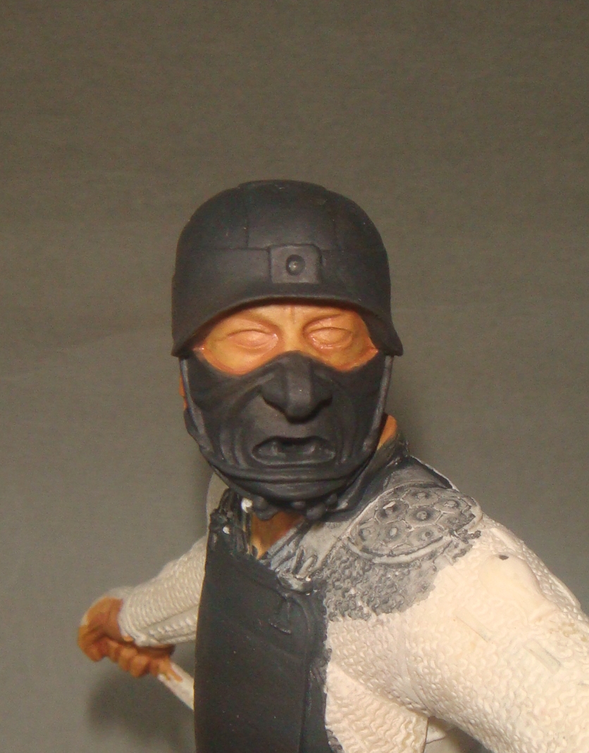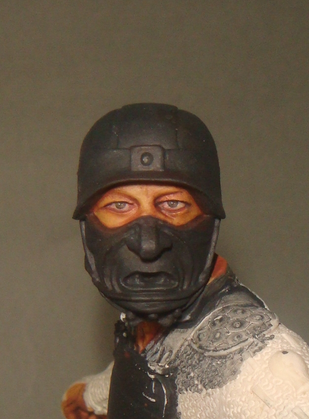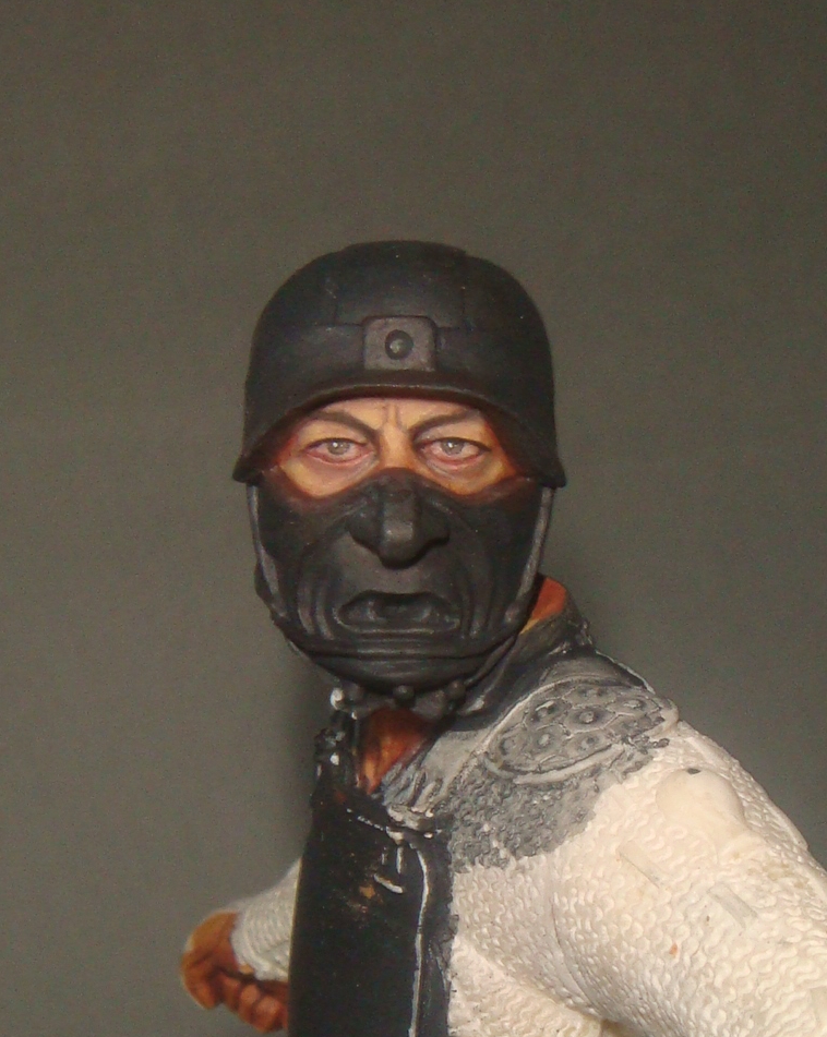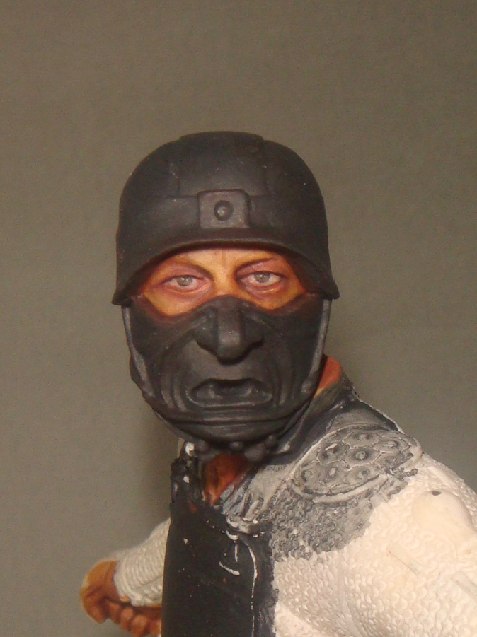 Итак.Во-первых я нанес базовый телесный цвет (фото 1) Намешан он из Brown Sand от Vallejo и желтого цвета от Хома.Затем (предпочитаю начинать с теней) я наношу в самые глубокие складки,впадины и тд. смесь базового цвета с добавлением небольшого количества Cad.Red и Кирпичного от Звезда.Делаю буквально 2-3 лессировки,каждый мазок растушевуется влажной кистью (фото 2) Потом делаю тень более активной добавляя в базовую смесь еще большее ко-во вышеназванных красок (фото 3) - опять-таки следуют 2-3 захода лессировок с растушевками(на данном этапе плавностью переходов я не сильно озабочен,мне важно увидеть рельеф и общую свето-теневую игру)