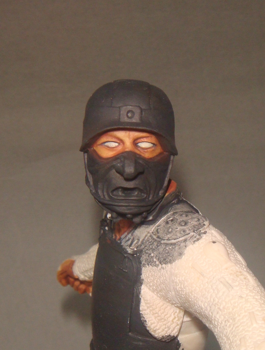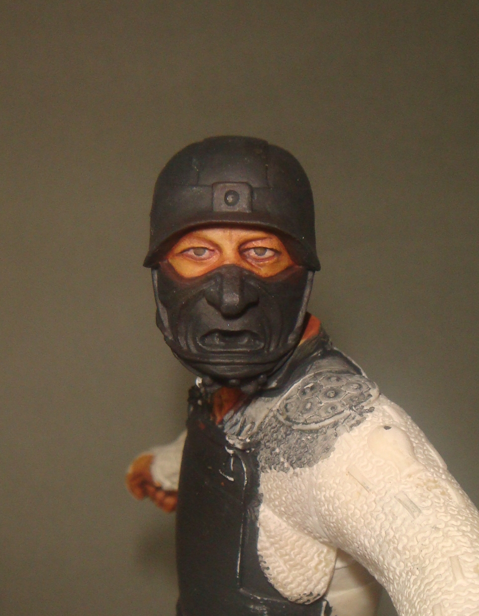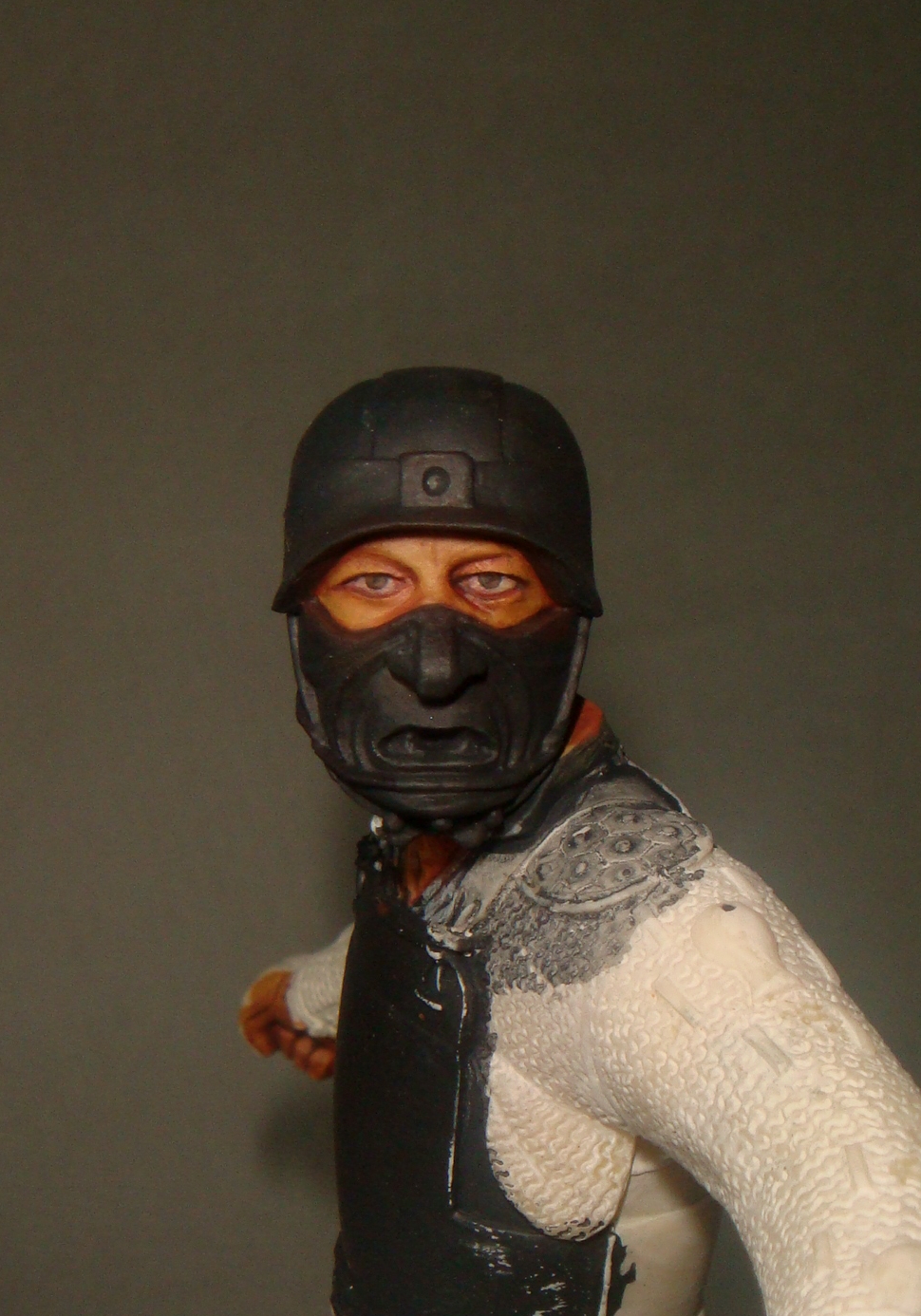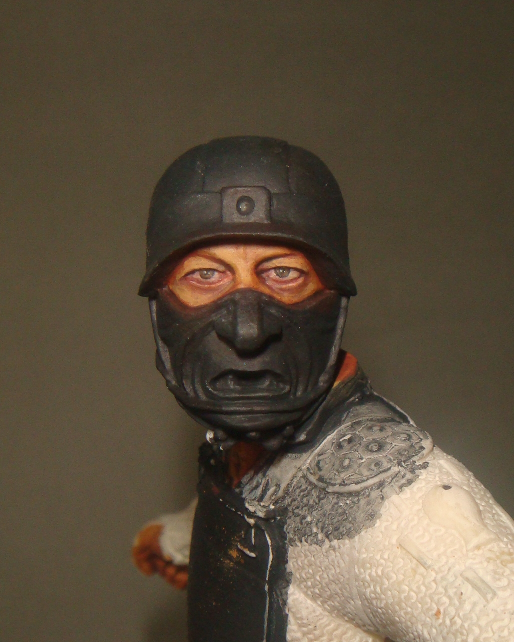 Итак.Во-первых я нанес базовый телесный цвет (фото 1) Намешан он из Brown Sand от Vallejo и желтого цвета от Хома.Затем (предпочитаю начинать с теней) я наношу в самые глубокие складки,впадины и тд. смесь базового цвета с добавлением небольшого количества Cad.Red и Кирпичного от Звезда.Делаю буквально 2-3 лессировки,каждый мазок растушевуется влажной кистью (фото 2) Потом делаю тень более активной добавляя в базовую смесь еще большее ко-во вышеназванных красок (фото 3) - опять-таки следуют 2-3 захода лессировок с растушевками(на данном этапе плавностью переходов я не сильно озабочен,мне важно увидеть рельеф и общую свето-теневую игру)
