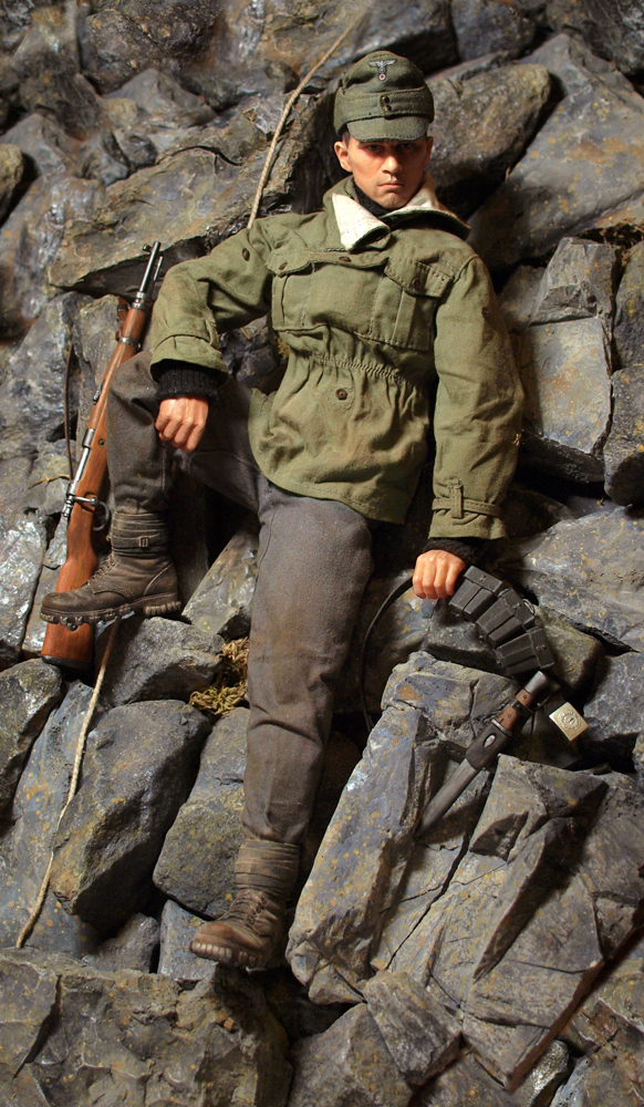 Исходником послужила фигурка Dragon. От неё же взяты брюки, ботинки, штык-нож, карабин и подсумок для обойм. Анорак, кепи и ремень - от фигурки Toys Siti.
