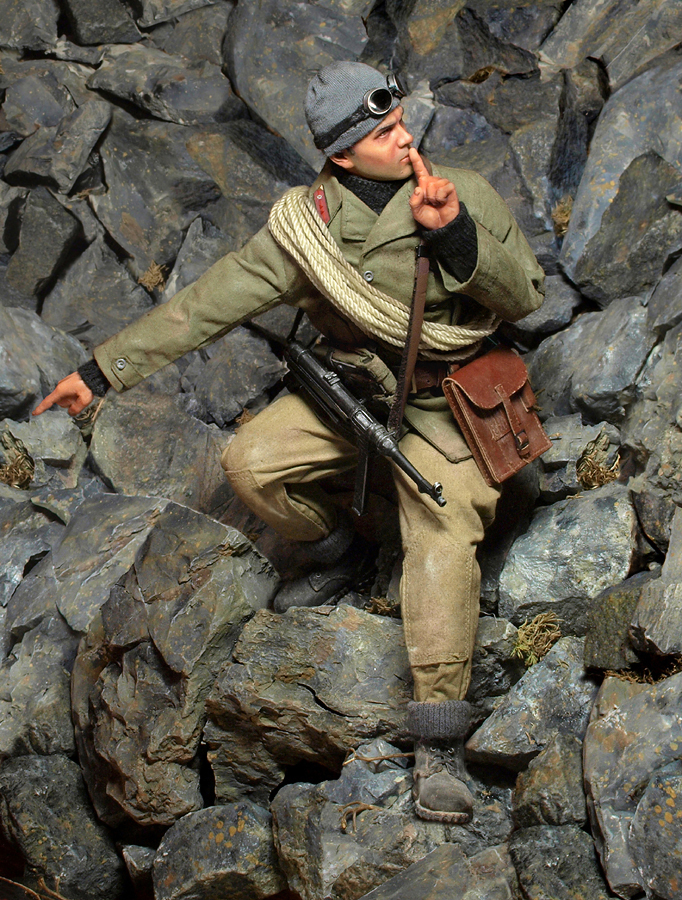 По фигуре.Белый отворот анорака сильно дисанирует с другими загрязнёными деталями одежды.Подсумки стоило заменить на кожанные или перекрасить,сделав более потёртыми.Может стоило поработать с руками уж больно они чистые.Ботинки на общих фотографиях выгледят антуражно,но на крупных планах больше подходят пехотинцу ходящиму по жидкой грязи.И последнее,зачем было перекрашивать хорошую голову? Только для исправления косоглазия? Карабии получился хорошо.Можно ешё перед покраской пройтис наждаком,тогда появится рельеф дерева.