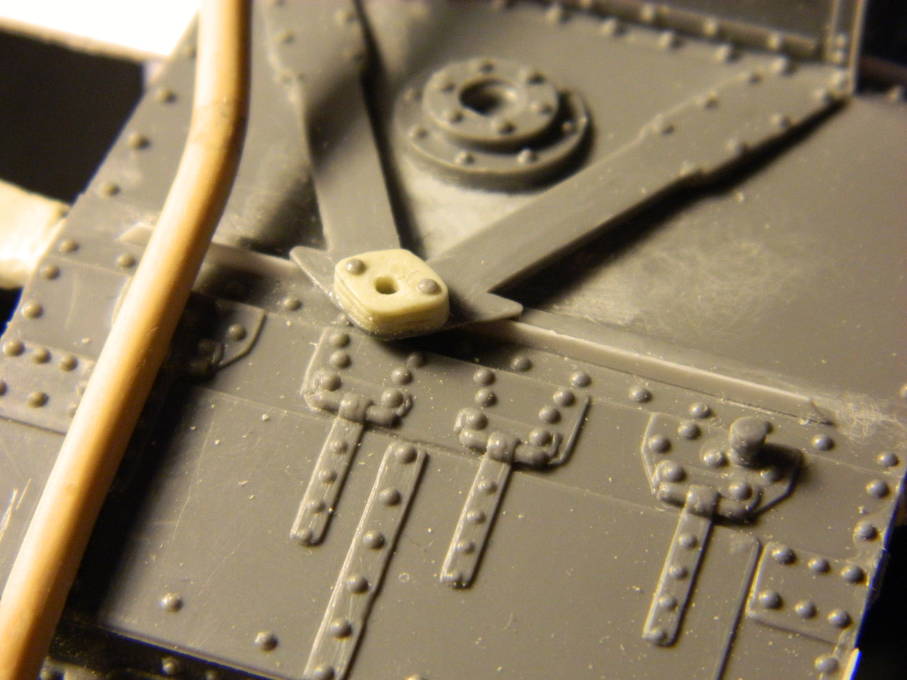 Что имеется уже на сегодня? В разгаре работа над танком Mark-V от фирмы Interus. Те, кто сталкивался, знают - модель не из простых, если делать по-хорошему. Практически всё, что выставляется над бронёй, пришлось переделывать, да и саму броню производитель сделал с косяком - расшивка бортов воспроизведена не в виде щелей, а рельефными валиками, напоминающими скорее сварные швы. Их пришлось соскоблить и прочертить щели. Глушитель имел мало общего с настоящим - изготовлен новый. Воздухозаборник рядом с ним тоже: его форму производитель просто напросто придумал. Кое-где добавлены недостающие, забытые производителем детали. Много работы потребовала корма танка - добавлены маслопроводы, ведущие к звёздочкам, изготовлена откидная решётка, которую производитель не воспроизвёл, но которая была практически на всех машинах.