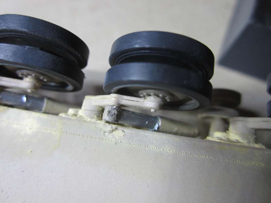 С установкой опорных катков на место на штоки балансиров есть проблема, очень тонкий балансир и если каток встает криво, балансир может сломаться.
