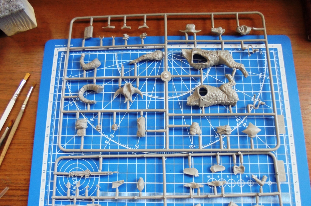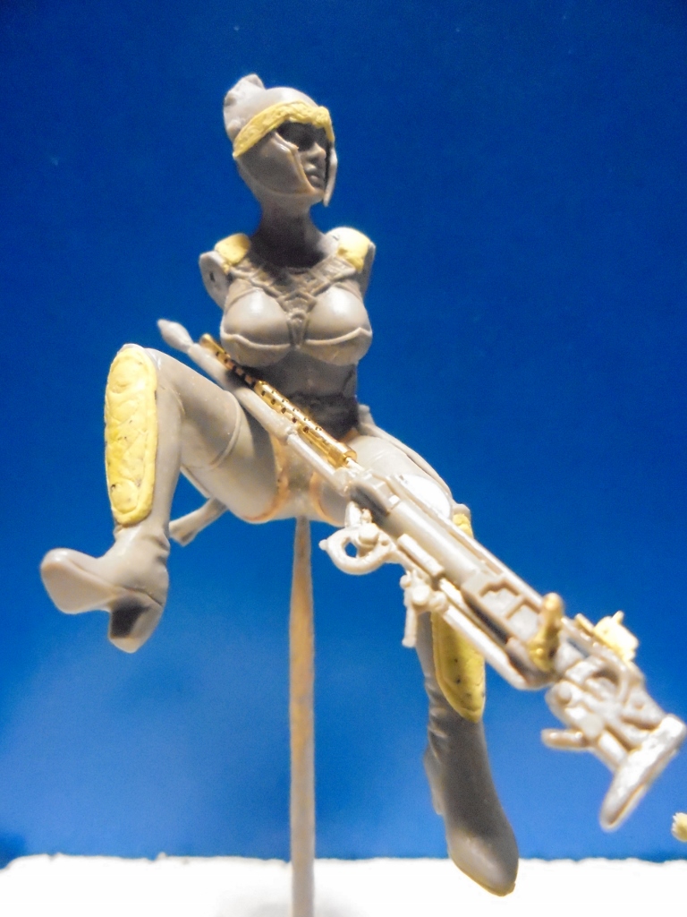 Ну что,приступаем к работе.Для начала отделил и зачистил все детали.Склеил монстра и пролил швы жидкой шпаклевкой.Амазонке приделал голову,руки оставил под покраску.С оружием поработал на свой вкус-приклеил перфорированный кожух от англ. пулемета,прицел,добавил кое-какие заклепки и болты для красоты.Тематика-фентези,поэтому не ищите сходство с оригиналом.