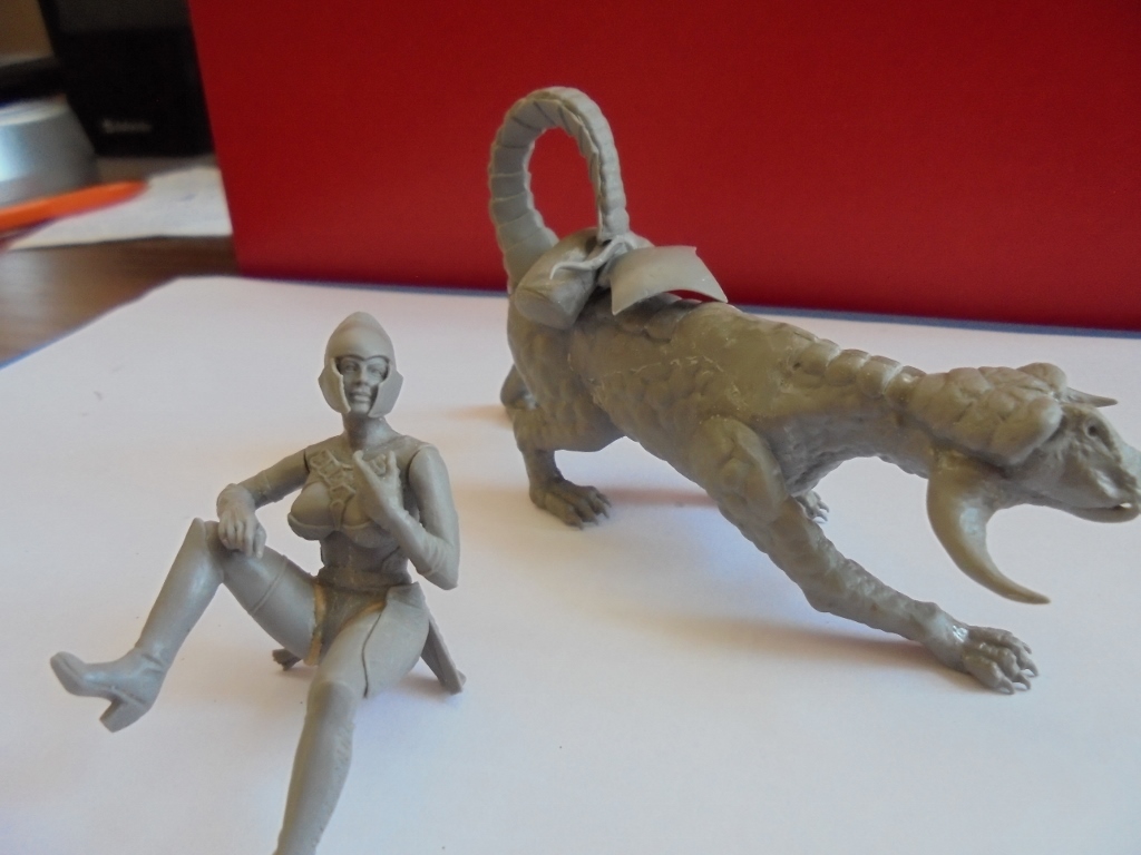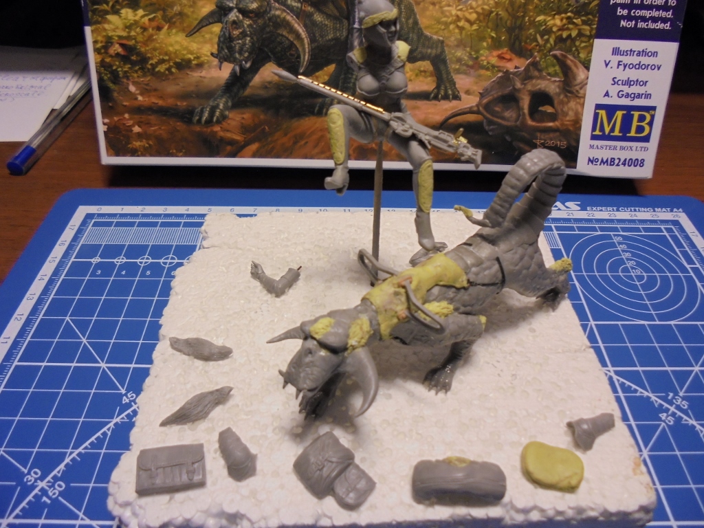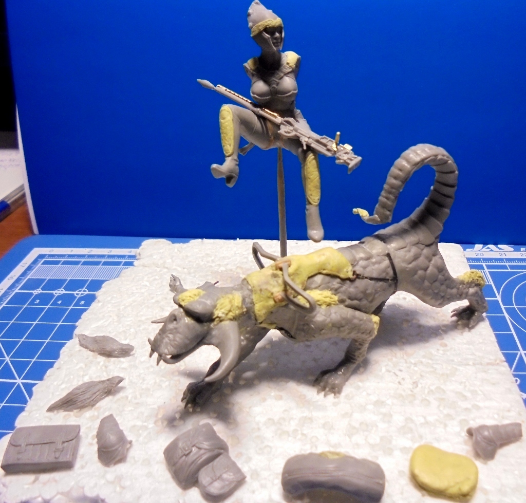 Продолжаем движение вперед.Только вперед!Решил,как многие на этом сайте,попробовать себя скульптором.Поэтому приобрел милипут двух видов:желтый и белый,Кто может подсказать,правда,что милипут надо хранить в холодильнике и почему белый стоит в два раза дороже?Сначала поработал со шлемом:приклеил конусные болты,слепил произвольный узор на козырьке,выровнял плоскость щитков.Долепил мет.ленты на теле,щитки на сапогах.Сделал сидалище,придав фактуру кожи,натянул и примерил предварительно ремни из ф.т.Да,не мог сначала понять,что за четырехугольная выпуклая деталь.Потом сообразил,что это хвост зверюги,на котором сидит амазонка.Решил ее выкинуть и слепить подушку,подогнав фигуру.Так оно логичней:скакать по бездорожью на мягком.Пришлось подгонять и долепливать поперечную сумку.Боковые рюкзаки я проработал ножиком и иголкой,лямки не стал срезать-они хорошего качества.Да,и пролил все швы еще раз жидкой шпаклевкой,особенно,глазные яблоки у зверюги.Поэтому фигура сильно блестит.Чтобы разбавить пластичность долепил волосяной покров там,где он мог бы расти