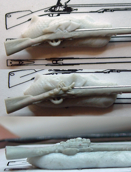 Обратите внимание, игла от шприца цилиндрическая, а ствол ружья - конический, в казенной части он изрядно толще, чем у дульного среза. Это очень заметная деталь, которая сводит на нет все усилия по деталировке замка и всего остального. Все равно в итоге будет смотреться, как муляжи ружей у некоторых "реконструкторов", сляпанные из дреколья и обрезков водопроводных труб.
