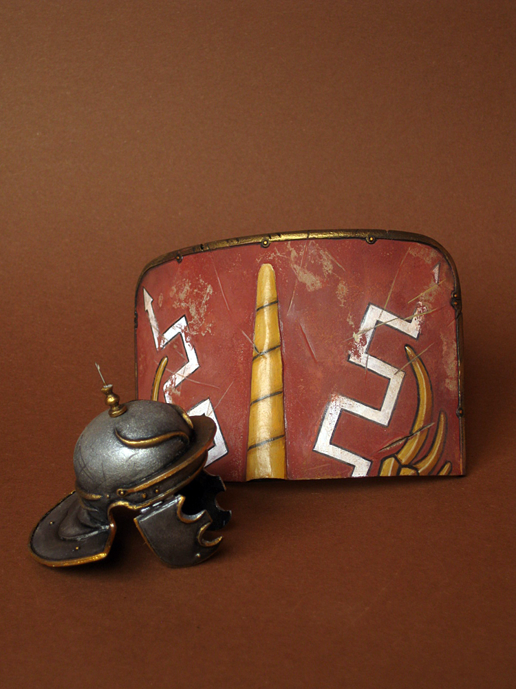 . Превосходный центурион . Фалеры и прочее бронзово - железное, вещь. Как вариант , можно сильнее сделать перепад между базовым(глянцевым) покрытием щита и матовыми эксплуатационными примочками . Так будет еще эхфектней