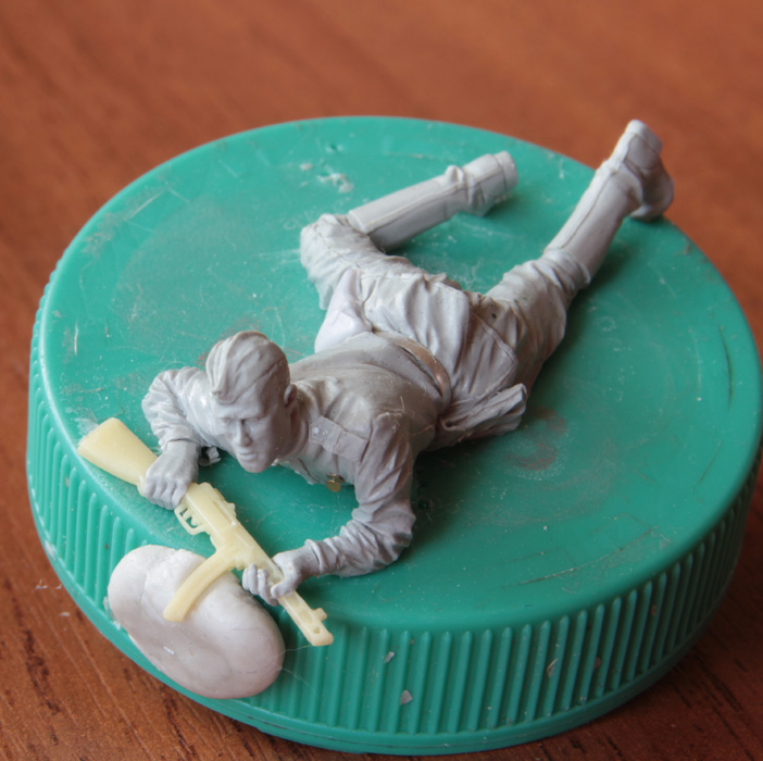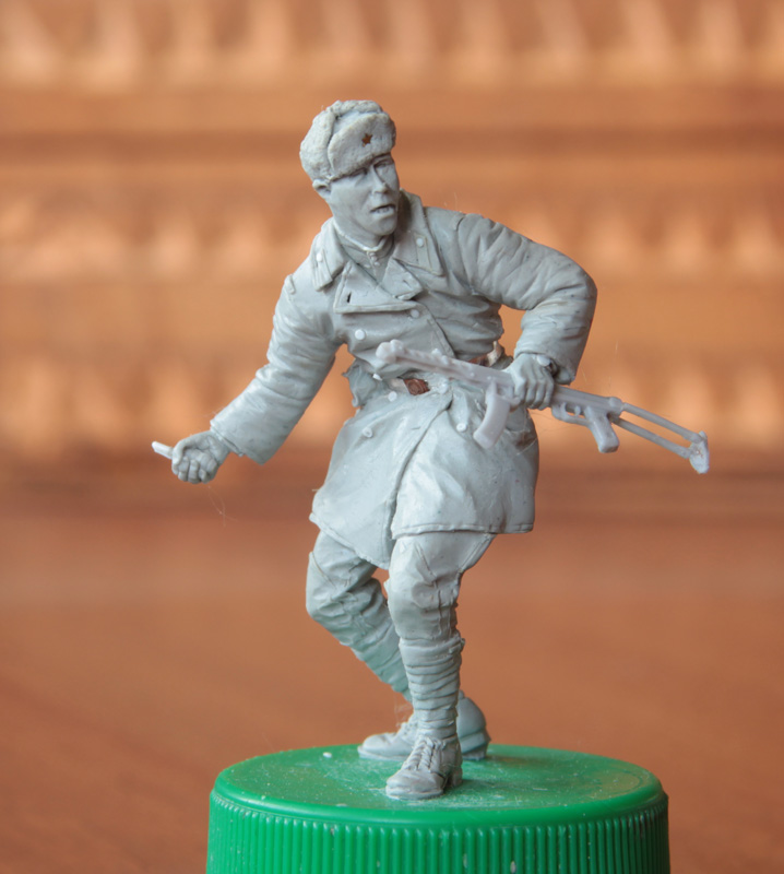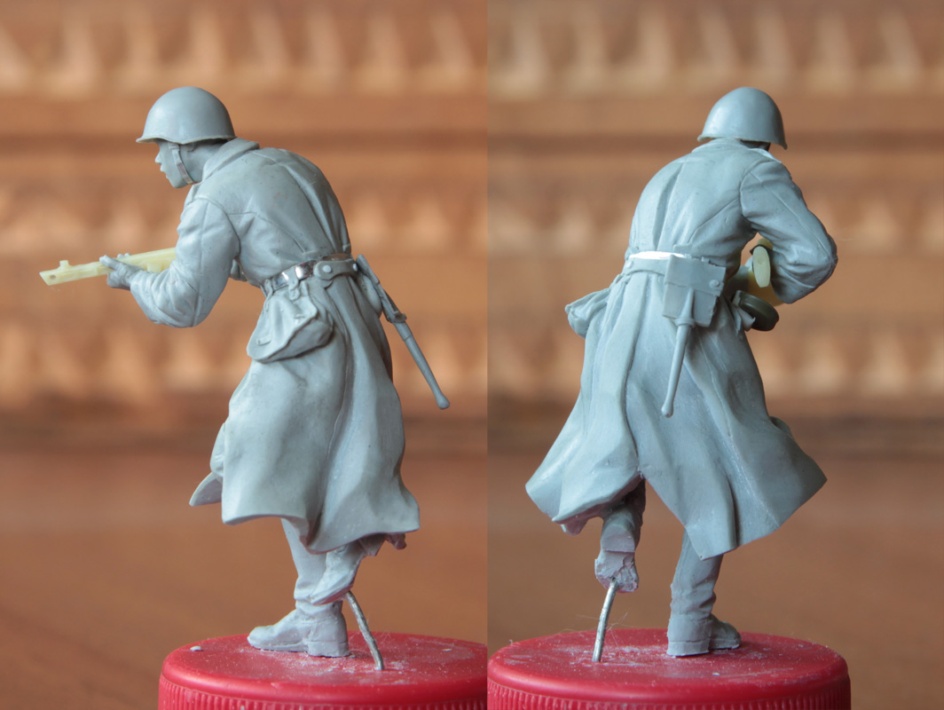 Первым в этой части будет бегущий боец с развевающимися полами шинели. Не мой взгляд, очень характерный образ второй половины войны. И известных фотографий таких бойцов много (а советские фотокоры, как известно, чё-попало не фотографировали и редакторы книг тоже не абы как фотографии подбирали). Сделал ему трофейную сухарку и диск ППШ на веревочке - очень характерный штришок иногда попадающийся на фото. На диске даже специальное ушко было.
