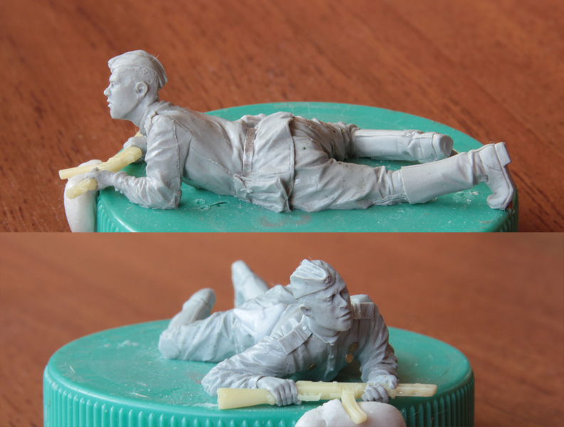 Дальше просто боец по фото. Интересно, делал ли кто-нибудь раньше фигурку с карабином обр. 1944 г.? На вскидку не вспомню, а ведь оружие весьма и весьма распространенное и хорошо повоевавшее.