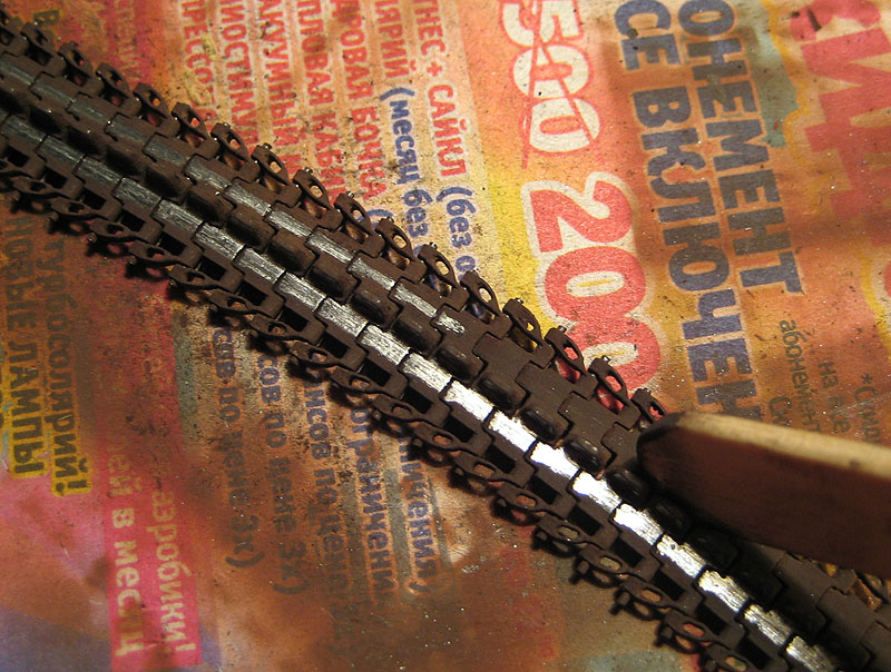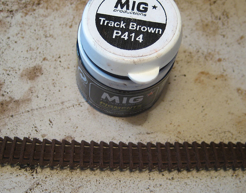 Для начала ленты были задуты коричневым акрилом XF-10. Я никогда НЕ грунтую металлические траки для того, чтобы их можно было натереть до блеска после нанесения пигментов.