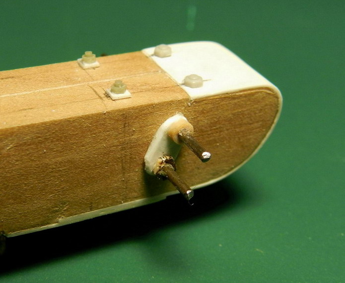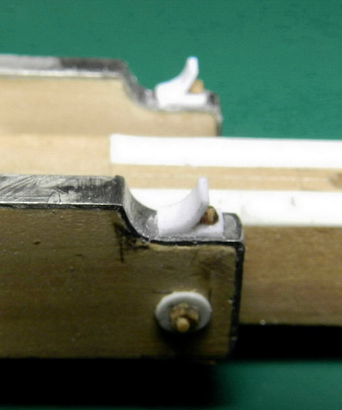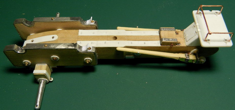 Продолжаю последовательно показывать работу над лафетом. Металлическую ось проковал из аллюминия. На короткие станины из прокованного припоя сделал оковки и поставил разделительные щайбы. Из листового полистирола изобразил оковки на стреле. Соединил короткие станины со стрелой и осью.