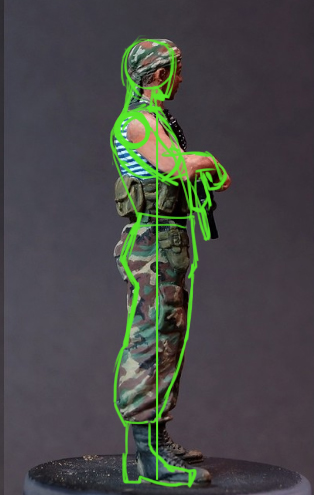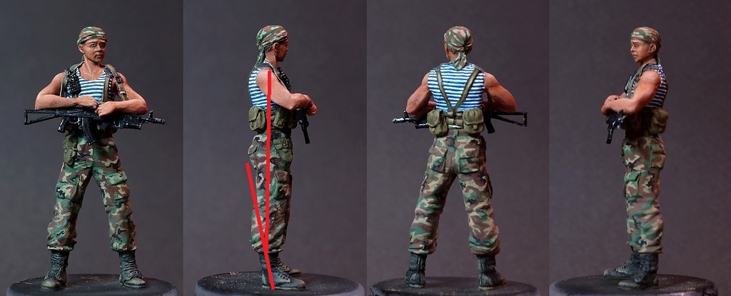 Роспись камуфляжа - отлично! Но по фигуре та же ошибка. Он должен стоять слегка наклоняясь вперед. А у тебя он падает назад. Так фигура выглядит хорошо, но если смотреть в профиль, то все достоинства работы пропадают.