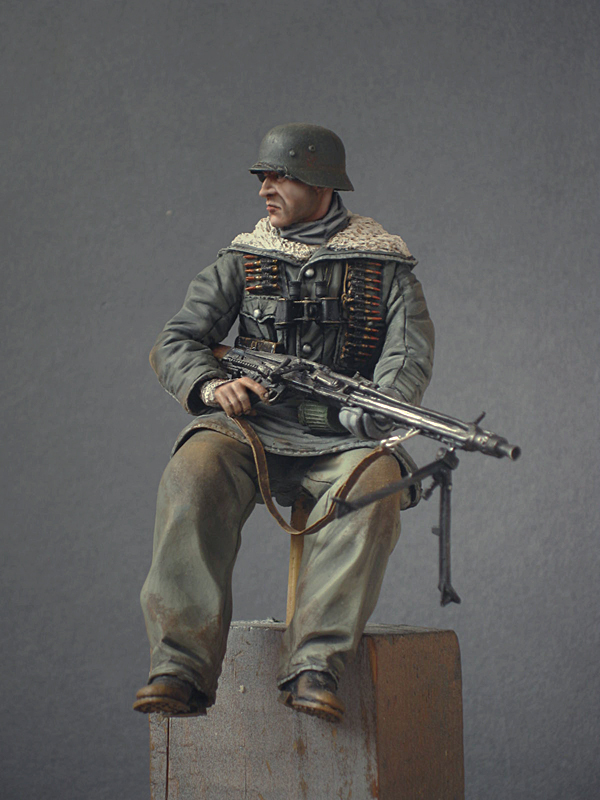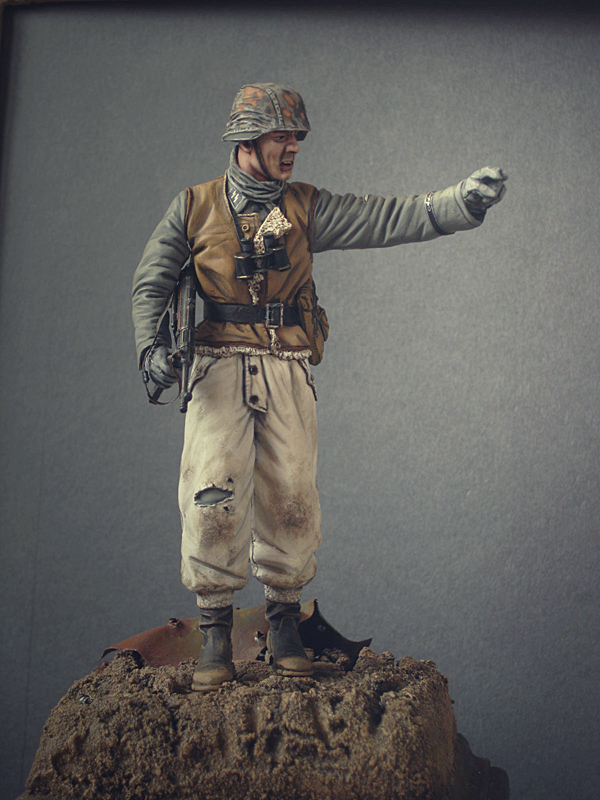 Признаюсь честно, не стал я этого персонажа в жилетке идентифицировать, и учитывая прежде всего ремень офицерский, сделал я его офицером, и петлички соответственные налепил. Ну не доработал, каюсь...