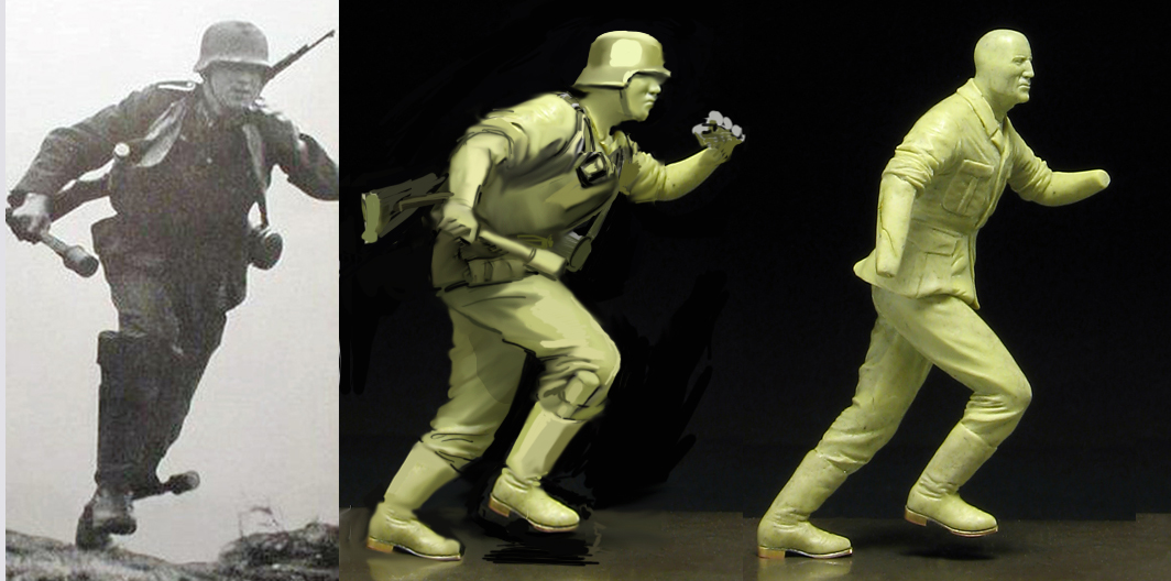 . Задумка не подразумевает несущегося на всех парах бойца. Он начинает движение, смотрит в сторону, оценивая ситуацию для принятия решения, плюс ко всему меняет направление движения. Есть у меня одно фото, там действительно, очень стремительно движение у солдата, но выкладывать не буду