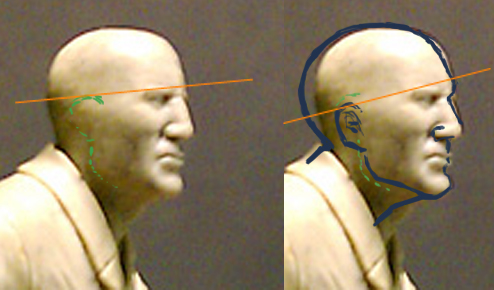 3)В раене переносицы слишком высокий нос, почти переходящий в лоб(в данном случае как раз без портретного сходства, а с учетом формы лба фигурки, возможно не так сильно, как у меня нарисовалось