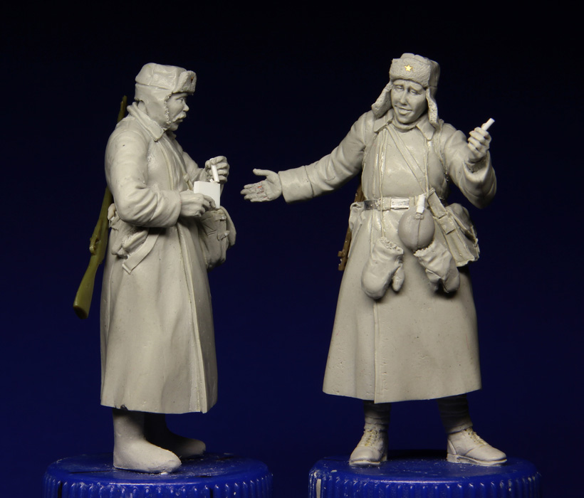 Ещё пара наших бойцов шуткует и пробует немецкие сигаретки. Давно хотел сделать таких плотно укутанных наших пехотинцев, фотографии долго собирал, поэтому и работа спорно шла.