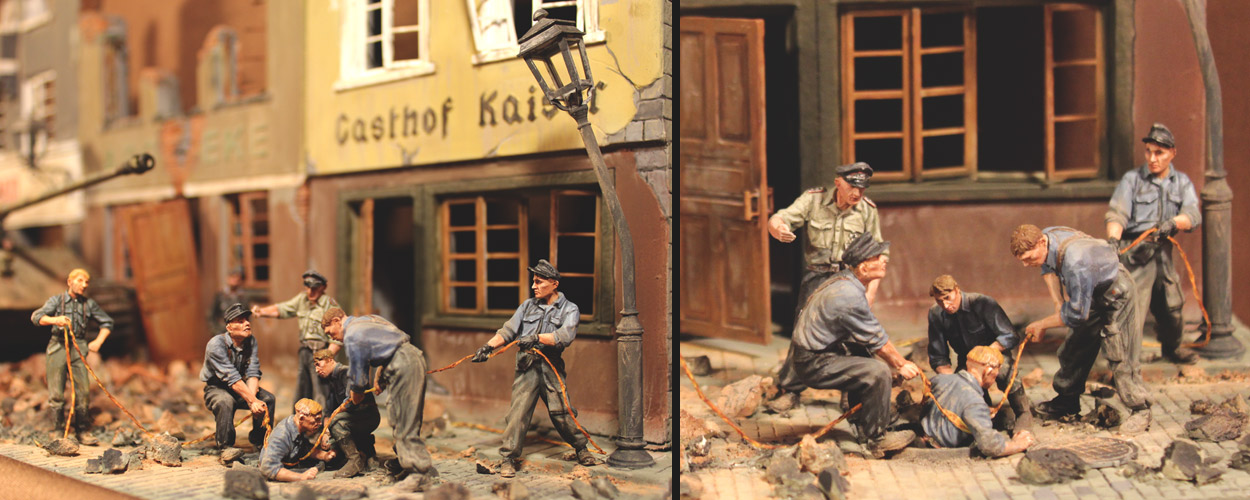 Часть диорамки, где одни ребята помогают сильно травмированному коллеге выбраться из местного бомбоубежища.