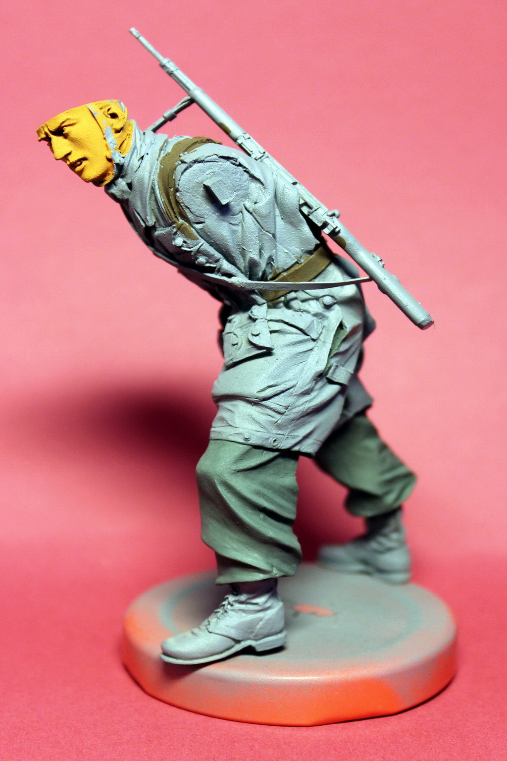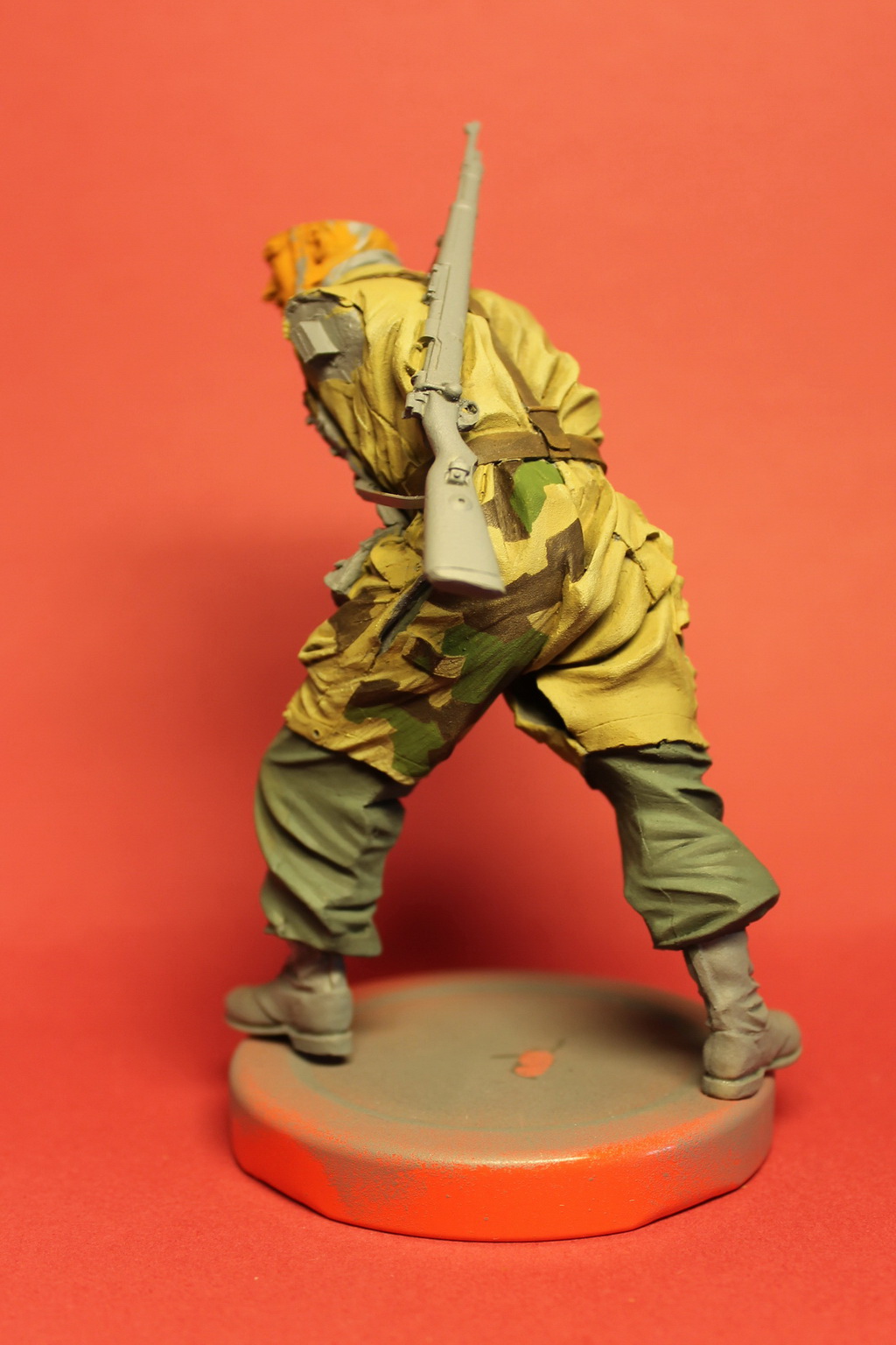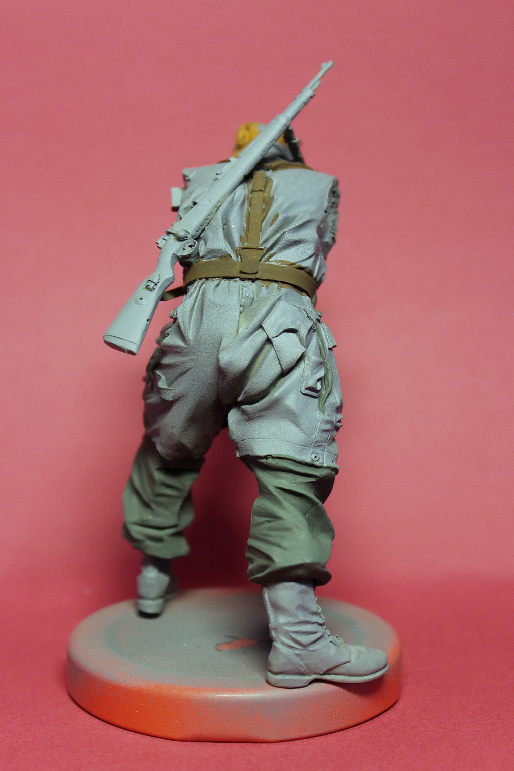 Накануне получил-таки посылочку от Константина Капитонова. В работе парашютист с панцершреком, 1/16 масштаб, новинка от Джеффа Шиу. Первое впечатление - грубоватая и хрупкая смола и ужасное сочленение ног и туловища: мало того, что по коленкам, так после стыковки остаются отверстия такие круглые. В общем - шпаклёвка в помощь. Мучаю штаны