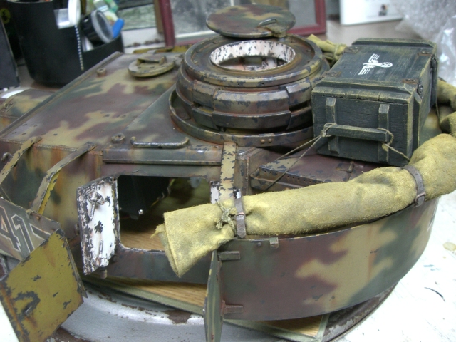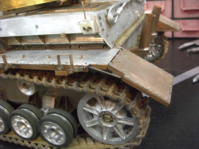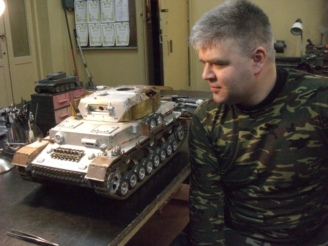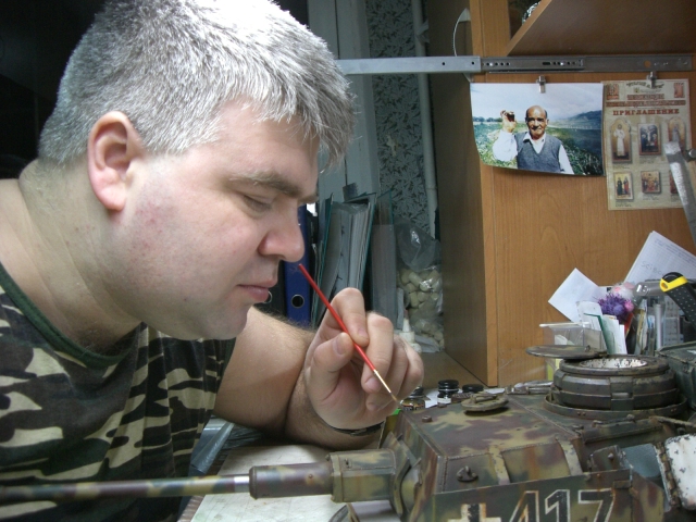 У меня сейчас в работе немецкий танк "Т-IV" но какой-масштаб 1:10.Самодельная радиоуправляемая модель из алюминия.Копийность 99%.Сделали её у нас в Одессе два Серёги(отец и сын)обалденные мастера-сделали всю механику и электрику срого соблюдая масштаб,а я вот раскрашиваю.Почти закончил башню и приступаю к корпусу.Звук двигателя,пулемёта и орудия записан от настоящего танка в Кубинке.При выстреле ствол откатывается и чуть погодя(пол секунды)корпус танка тоже слегка двигается как от отдачи-обалдеть.Жаль нельзя видео вставить.