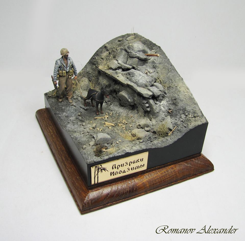 de_grivois у меня была возможность несколько дней покрутить всю композицию и по-расставлять все аксессуары. Композиция вся завязана в прямоугольник, сдвиг её по диагонали приводит к образованию пустот по краям. Вид получается какой-то кривой. Учитывая габариты диорамы 50*38 см добавлять ещё грунта тут только приводит к пустому увеличению площади диорамы и весу. Дуб как никак и строительной шпаклёвки тут много.