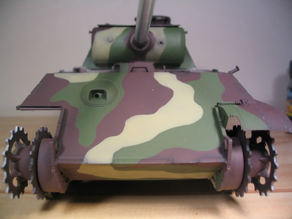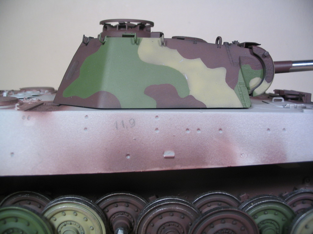Всем привет. После некоторого перерыва продолжу. Как то не было времени для любимого хобби в этот период, но зато посетил славный город Питер. Естественно прошёлся по некоторым злачным местам для нашего брата моделиста. Хотя цены в Питере просто заоблачные, но увидав последнию кopoбкy c Пантерoй F в Гуливере я долго не думал, и хватанул, тем более что на HLJ она занесена в наборы снятые с производства. И естественно, я просто неисправим, начал собирать башню хотя G-шка ещё не закончена. В конце концов я взял себя в руки и вернулся к G-шке. Выпала возможность заняться покраской и я успел кое где нанести камо. Вообшe это достаточно сложный и трудоёмкий процесс, но в то же время очень захватывающий. Я распечатал чертежи Пантеры и начал рисовать камуфляж сначала на этих четежах, на это ушёл ни один вечер. Вначале нарисовал те пятна которые хорошо видны на фото. Затем искал и складывал в отелнульную папку фотографии G-шек этого периода на которых виден рисунок камуфляжа. Работал простым карандашом и резинкой неоднократно поправляя пятна камо, пока не получилось то чем я был удовлетворён. Итак пока нанес камо на лобовой лист корпуса, и на борта и лоб башни.