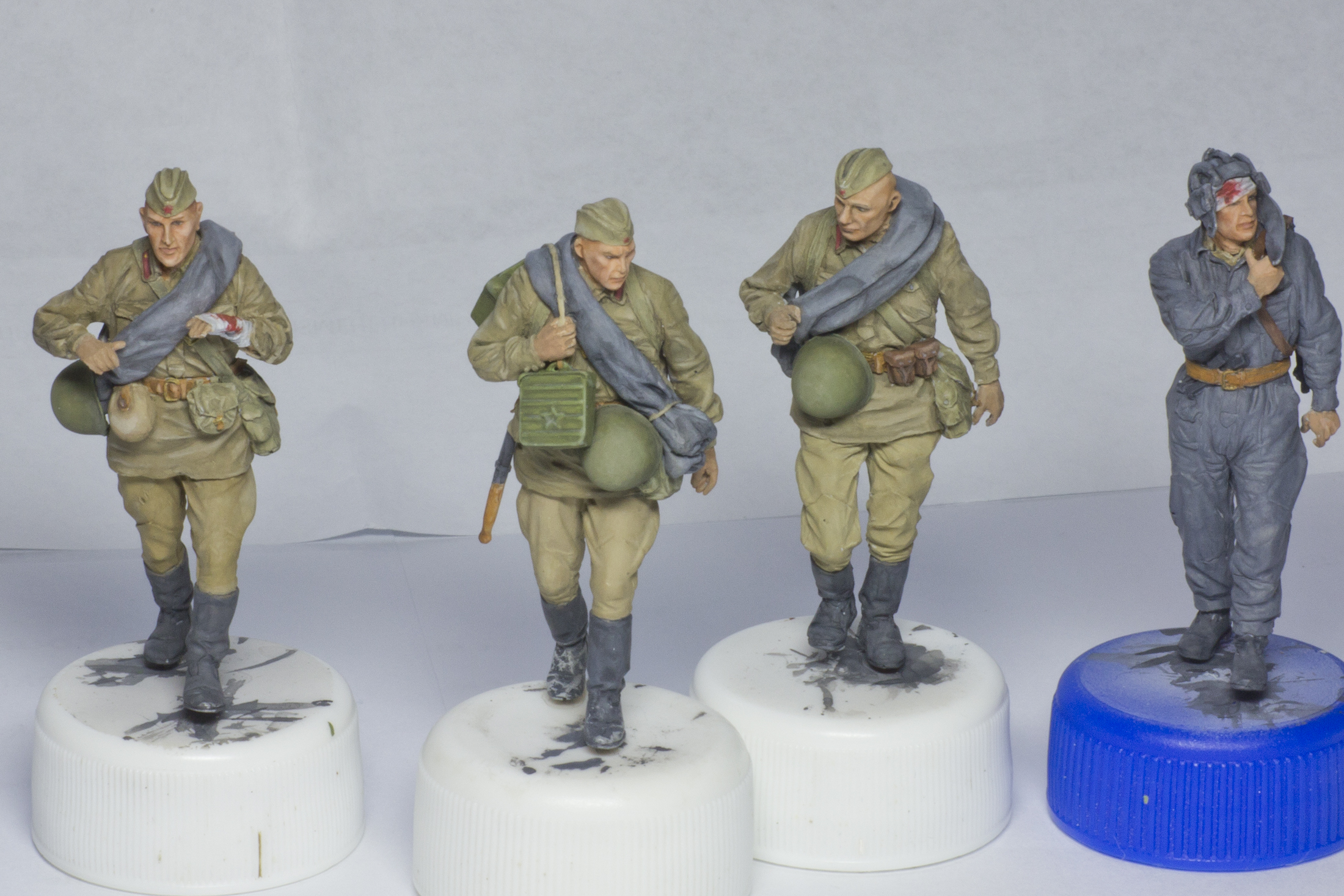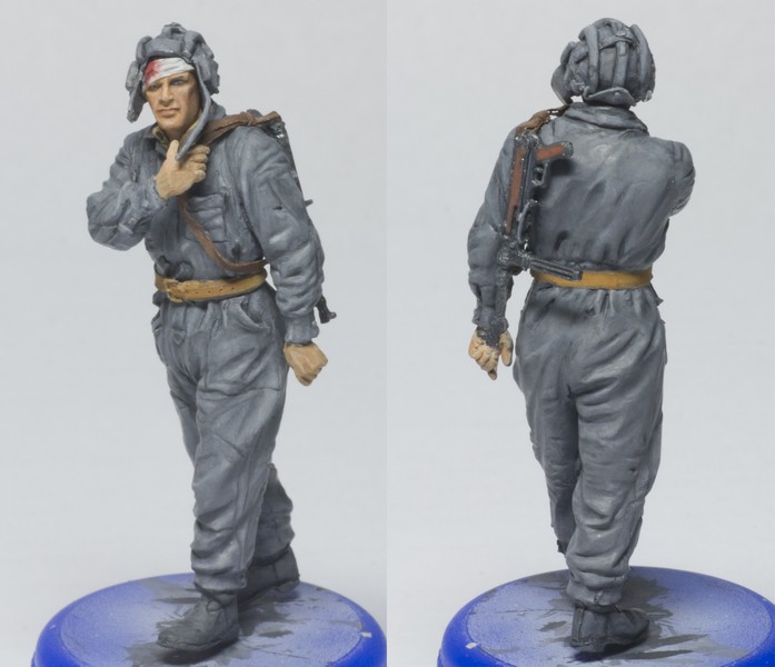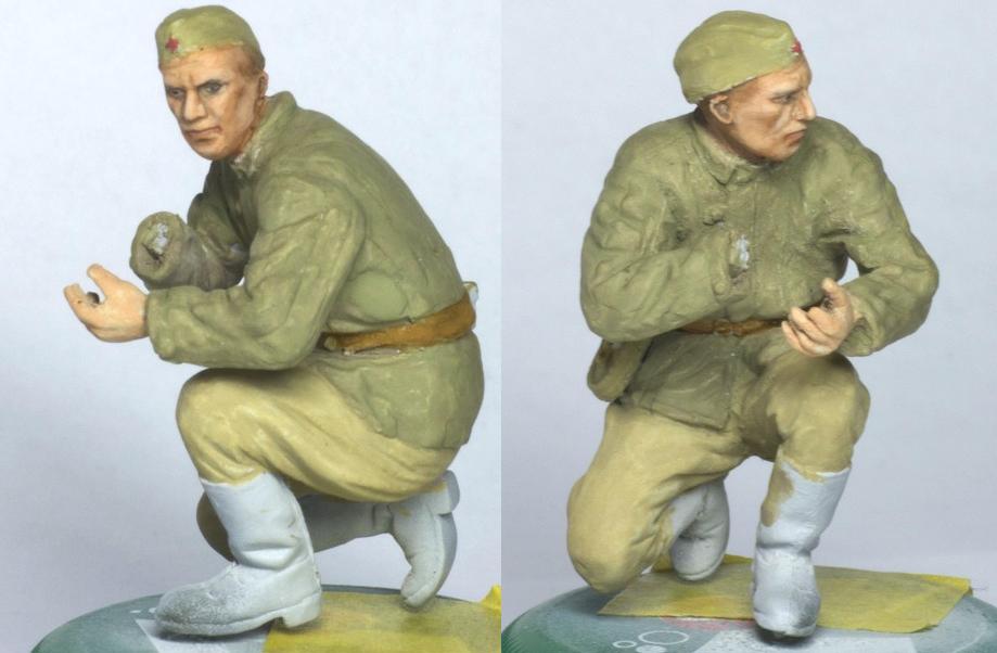 А добавите Вы туда вот эти, скажем так, достаточно посредственно покрашенные массово-тиражные фигурки, и сразу получится самая обычная диорама из разряда так всеми любимого штампа «Солдаты куда-то идут мимо подбитой техники».