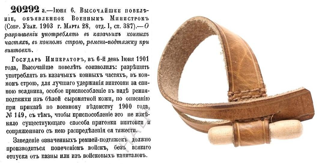Нашёл описание (пр. по военному ведомству №518 от 1909 г. (рис. 1)) и фото (рис. 2) погонного ремня. Порядок его пригонки нашёл для кавалерии (рис. 3). Допускаю, что для казаков было то-же но на другую сторону. Там-же есть описание ремня-подтяжки (балберки), использовавшегося в конном строю. Казакам он так-же "Высочайше разрешался" (Собр. Узак. 1903 г. Марта 28, отд. I, ст. 387 (рис. 4)). Следовательно, могло быть два варианта положения винтовки (рис. 5):