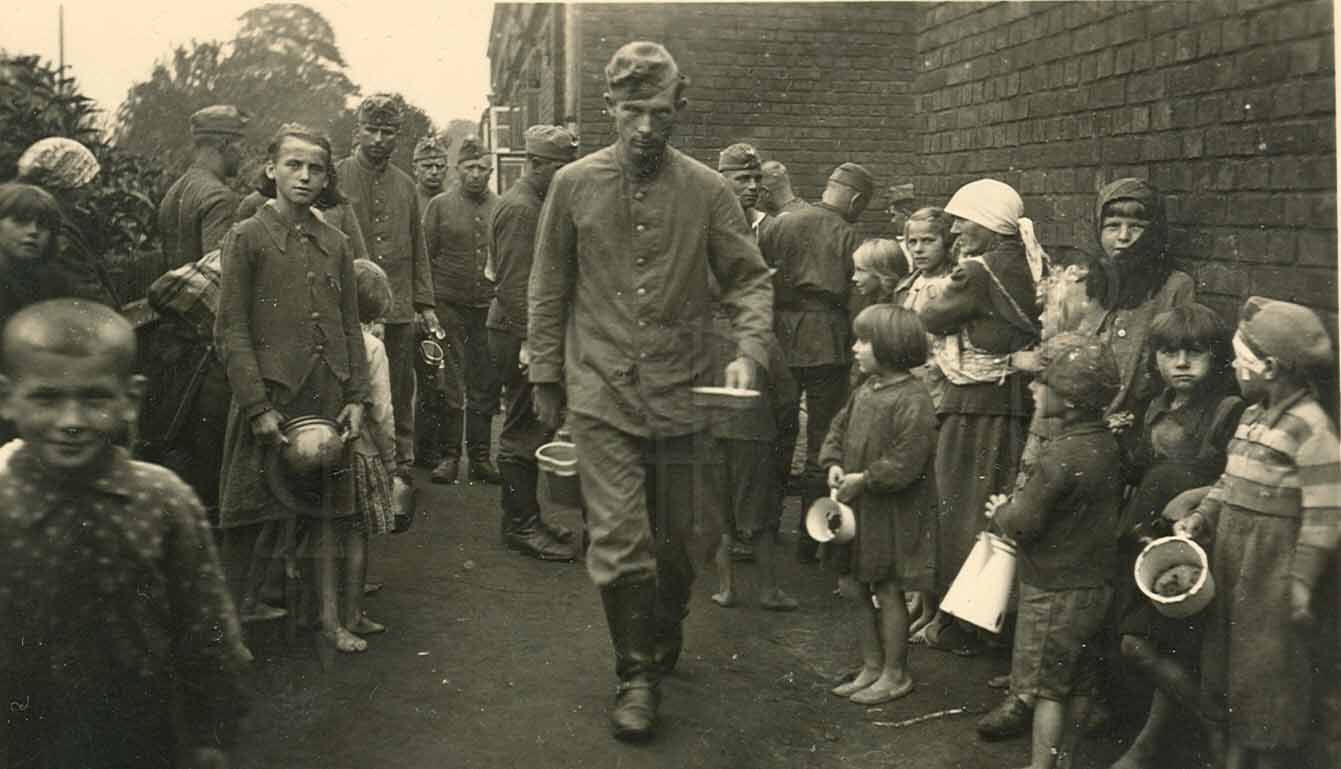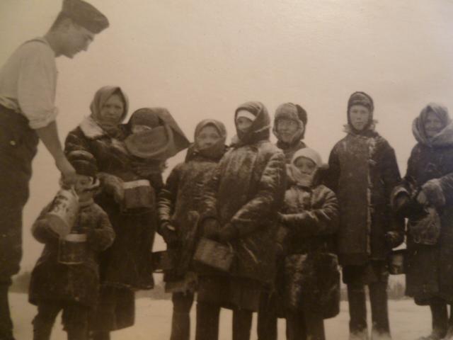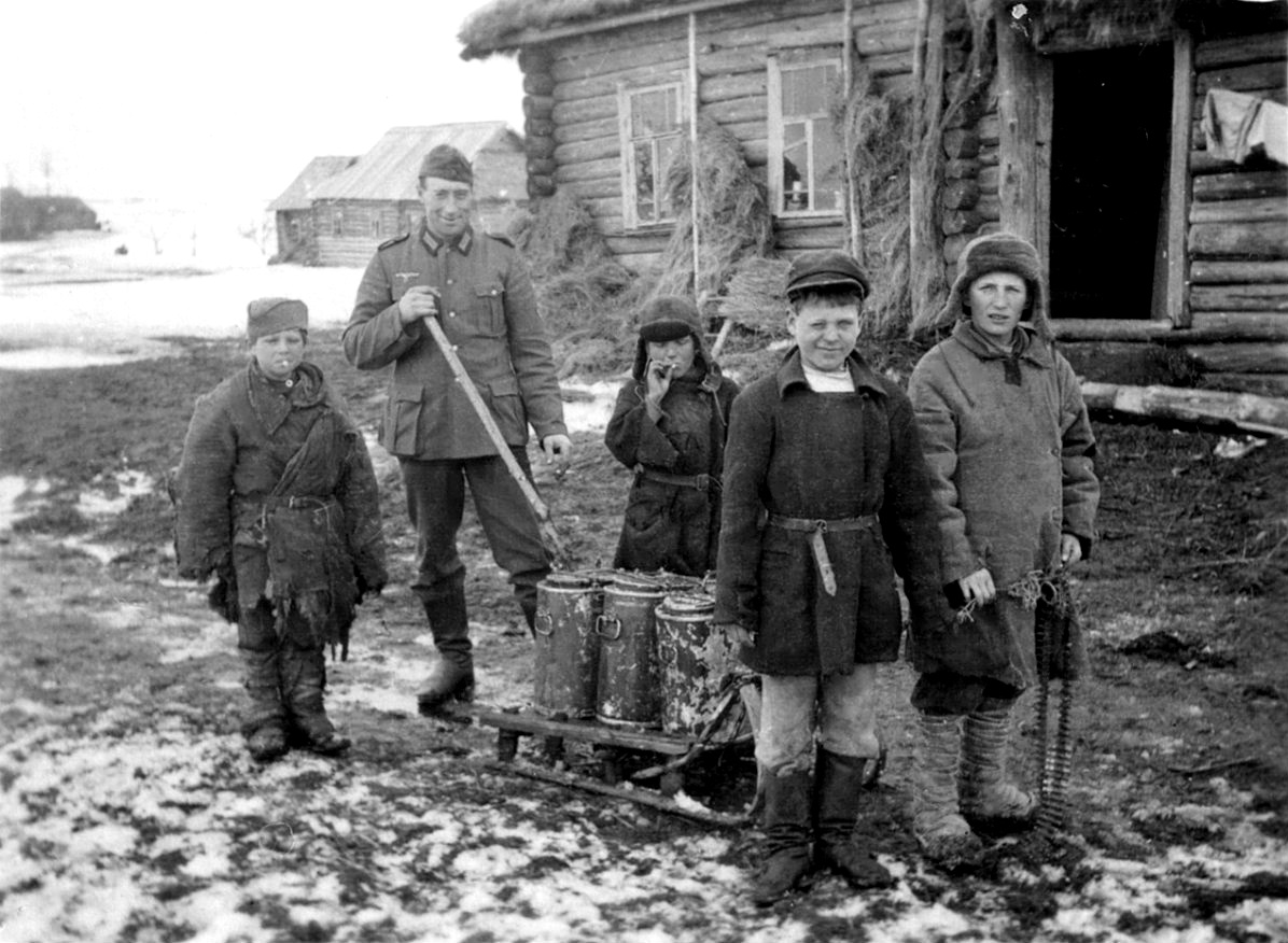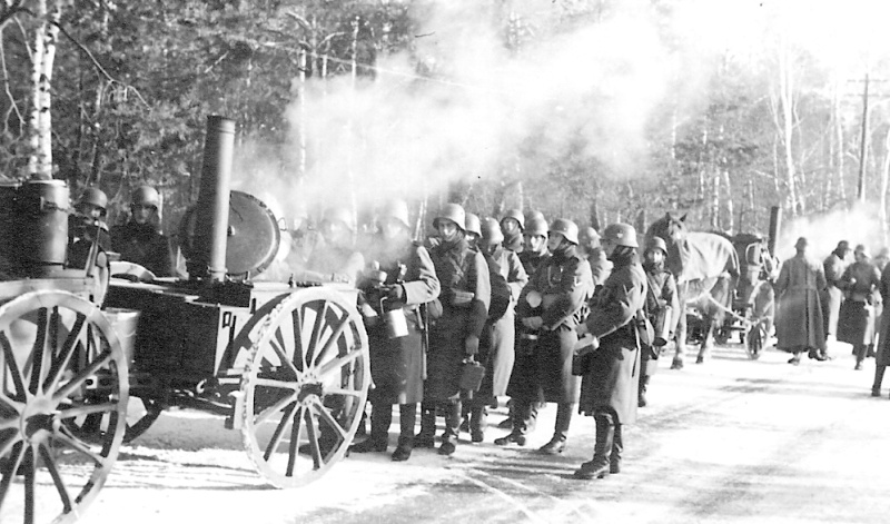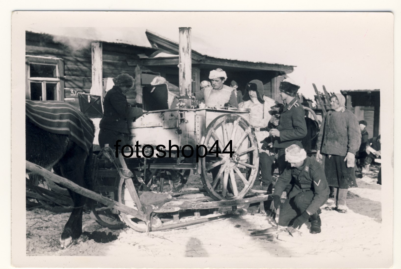Этакая зарисовка первой или второй зимы на Восточном фронте. Немцы едят гуляш и к кухне на запах еды вышли несколько голодных детей из разрушенной деревни...