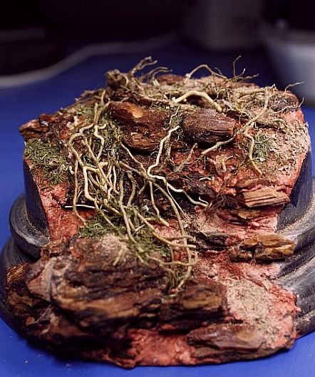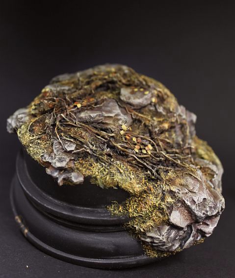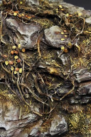 Давно уже заметила,что кора сосны сможет имтировать горные глыбы.Нанося глину и вставляя подрезанные к месту кусочки коры сформировала уклон,после высыхания залила суперклеем.Местами присыпая на клей укроп.Корни полыни для упавшего фрагмента дерева.Корни петуньи для имитации корней выбивающихся из под камней.Смотрится пока не очень,но лишнее можно всегда убрать.