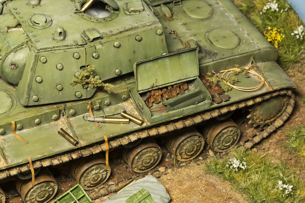 Да не, с запылением всё нормально - мне нравится, а вот траву стоит доработать. Сейчас на диораме такая образцово-показательная моделистская трава пучочками из пакли. Надо долго и нудно траву по одной травинке пинцетом высаживать - тогда и будет результат. Тем более площадь собственно травы не такая уж и большая - можно посидеть - сделать всё реалистично.