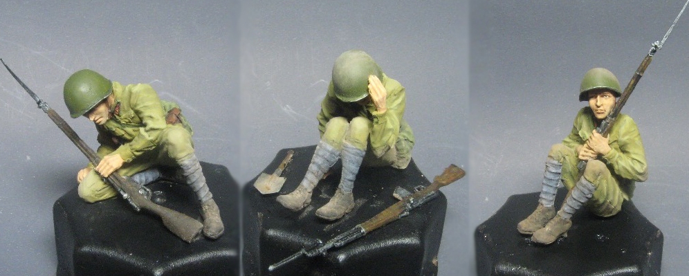 По сюжету виньетки это молодое пополнение которое только получило со складов новую и одинаковую форму и сразу на передовую.Там будут еще 2 бойца "бывалых" вот у них я уже собираюсьь форму сделать старую,выцвевшую и разных оттенков.