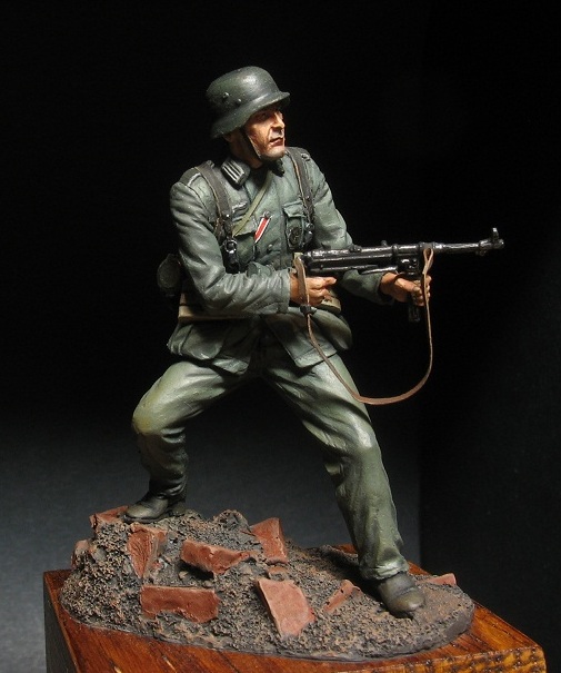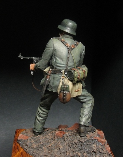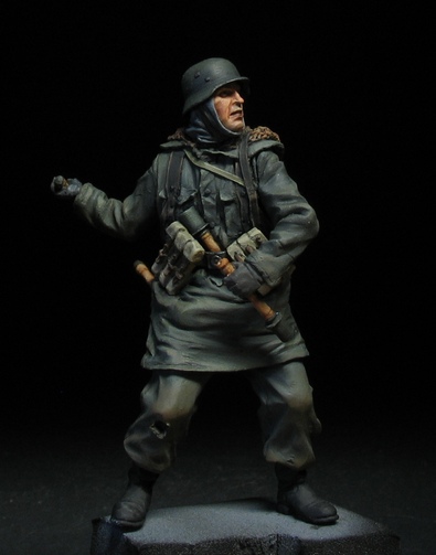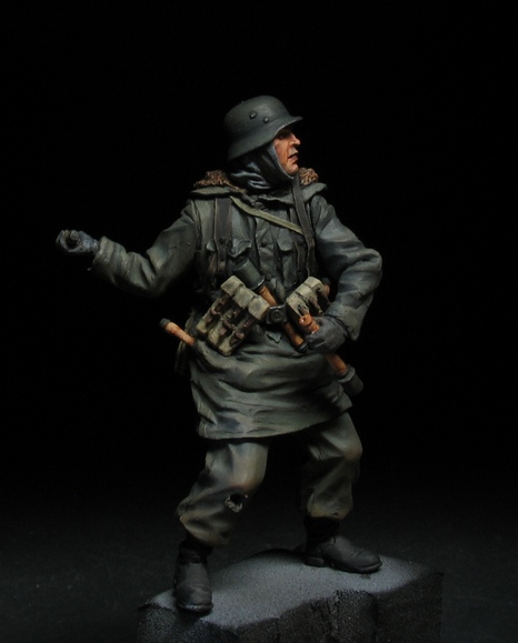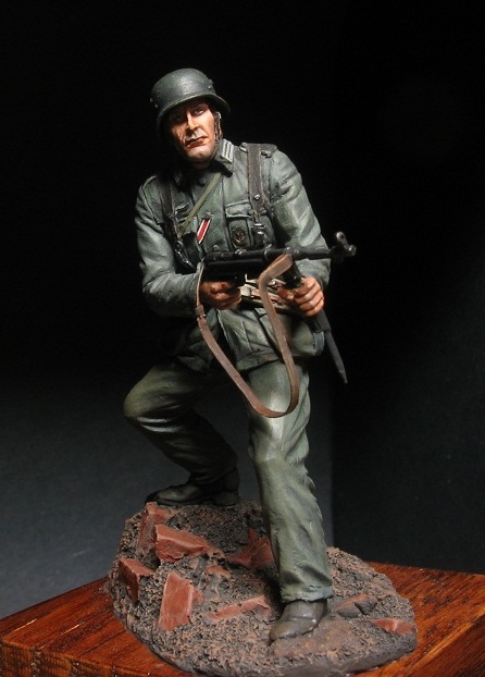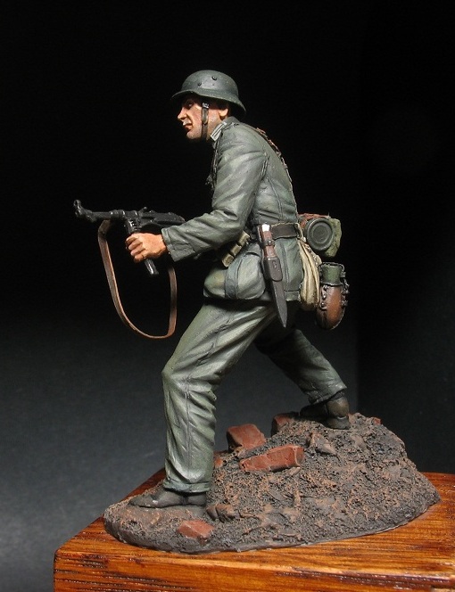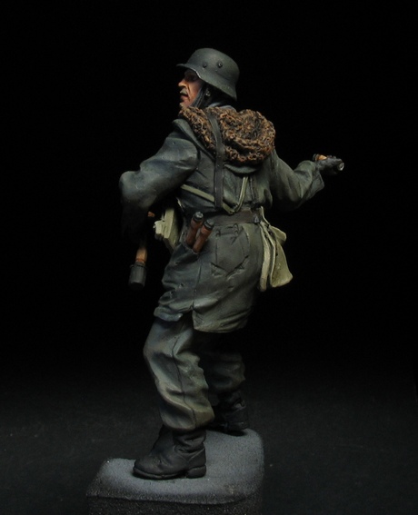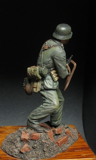 . Автор скульптуры узнаваем и новичком. Мне всегда нравились нестандартные элементы в ношении униформы, от этого фигурка только выигрывает и смотрится много интереснее. В данном случае это штаны на выпуск, шейный платок и самодельный чехол на каске. Самодельные чехлы на каски немецкие пехотинцы в Сталинграде ипользовали достаточно широко. Причем ткань была различная от простой мешковины и брезента до советской амебы и соответственно немецкого оскольчатого
