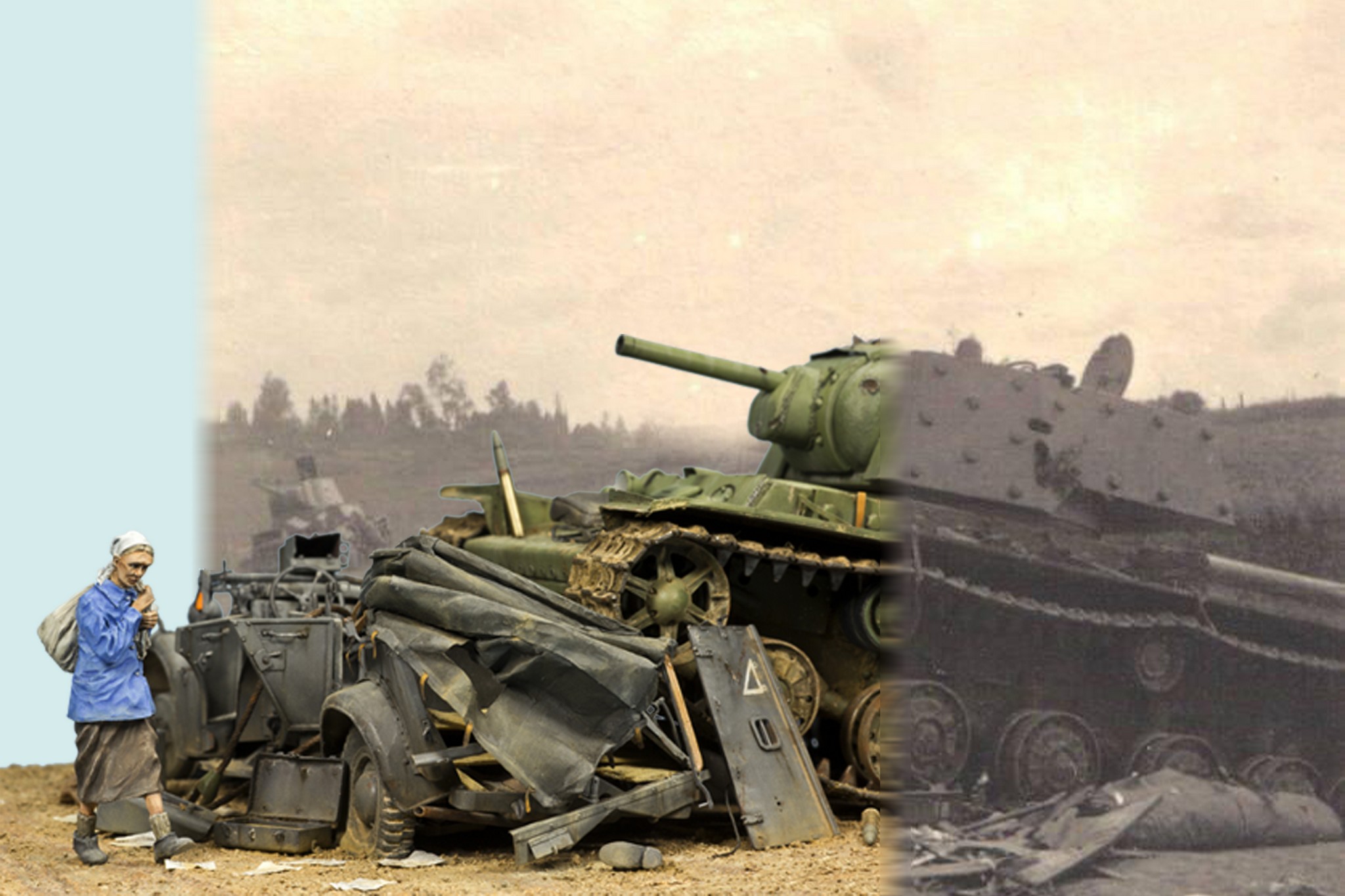Немец с кувалдой не в тему. Этот конкретный танк немцы не ремонтировали и особо не разбирали. Только гусеницы разомкнули, а потом просто взорвали. А вот Хорьх распотрошили знатно...